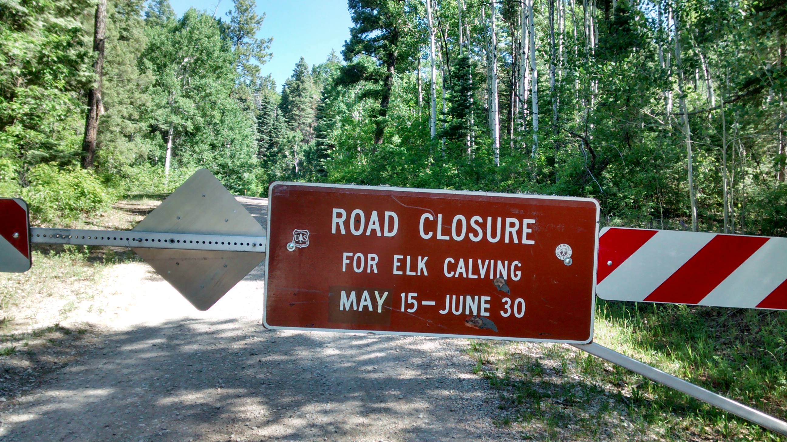 I was invited today to tag along with 3 leaders from the Albuquerque Senior Centers’ Hiking Groups on a hike in the San Pedro Parks Wilderness Area. One of the ladies was scheduled to lead the hike there next week. She was not familiar with the trail, but she knew that Sue was familiar with the area and could also give her some pointers on how to use her GPS device. Driving to the trailhead, about 10 miles from our destination parking spot, we encountered the above sign. We knew right away that it had been a wise decision to preview the hike the week before the senior’s group with a van full of unsuspecting hikers would run into this roadblock.