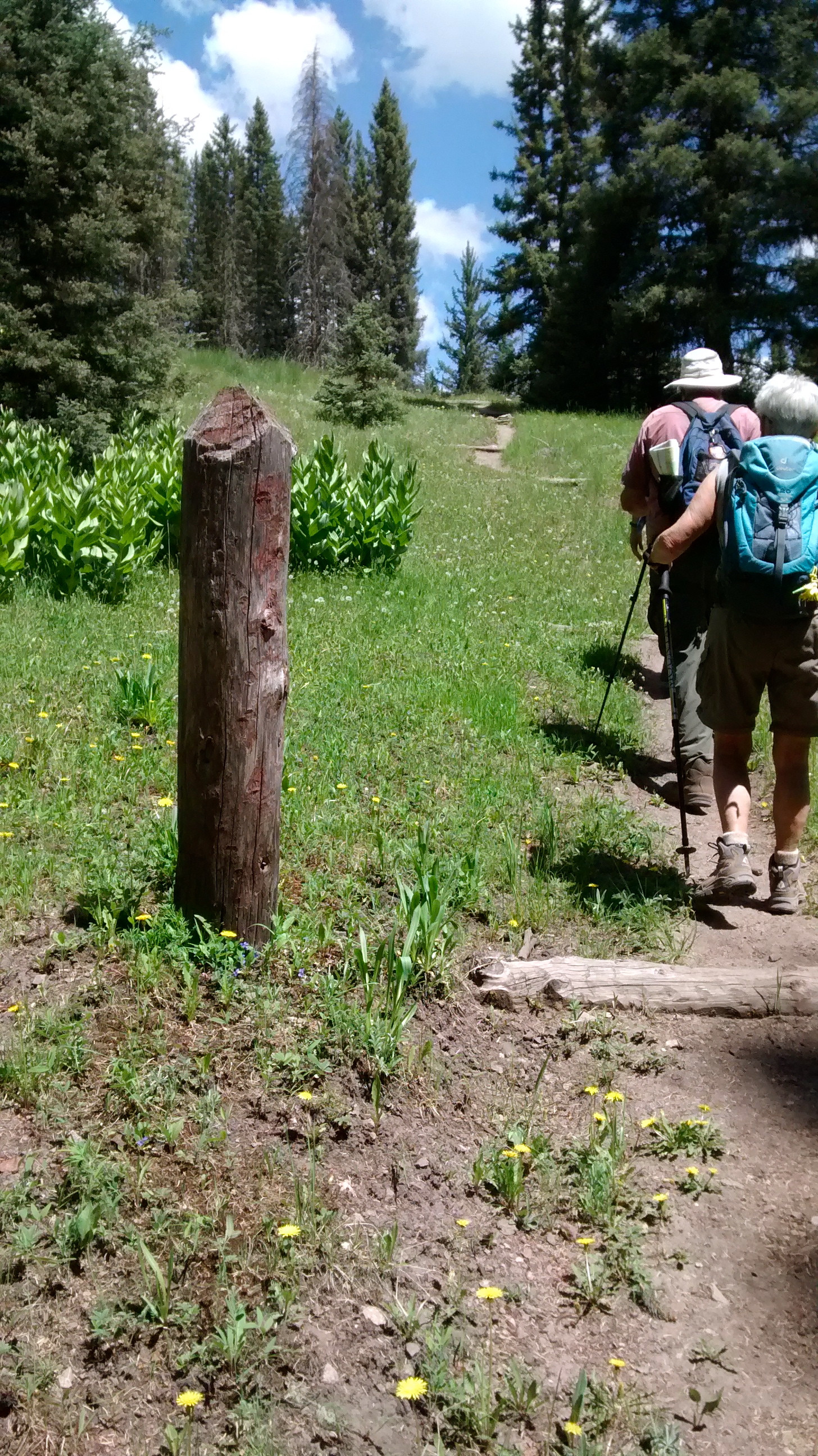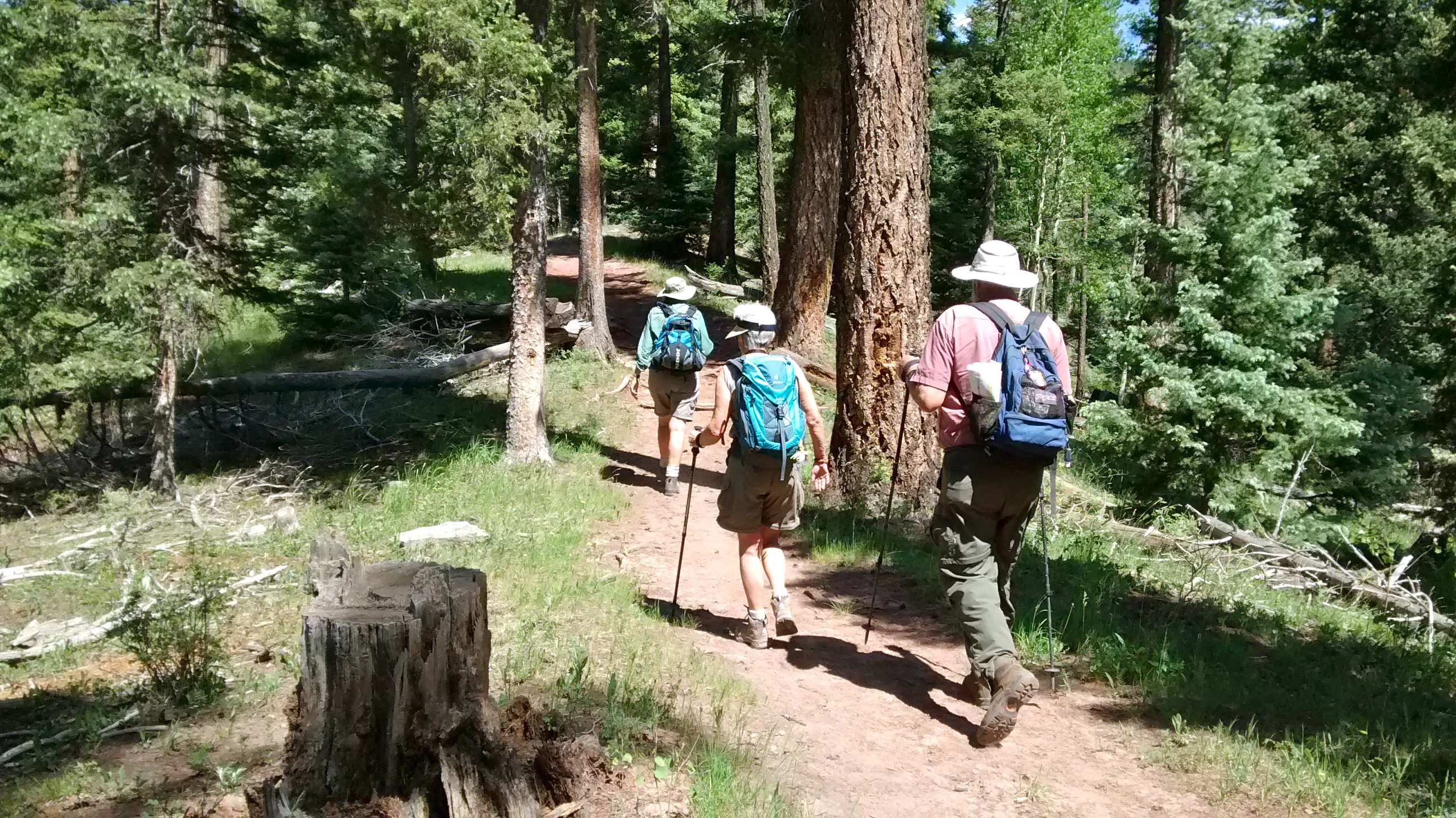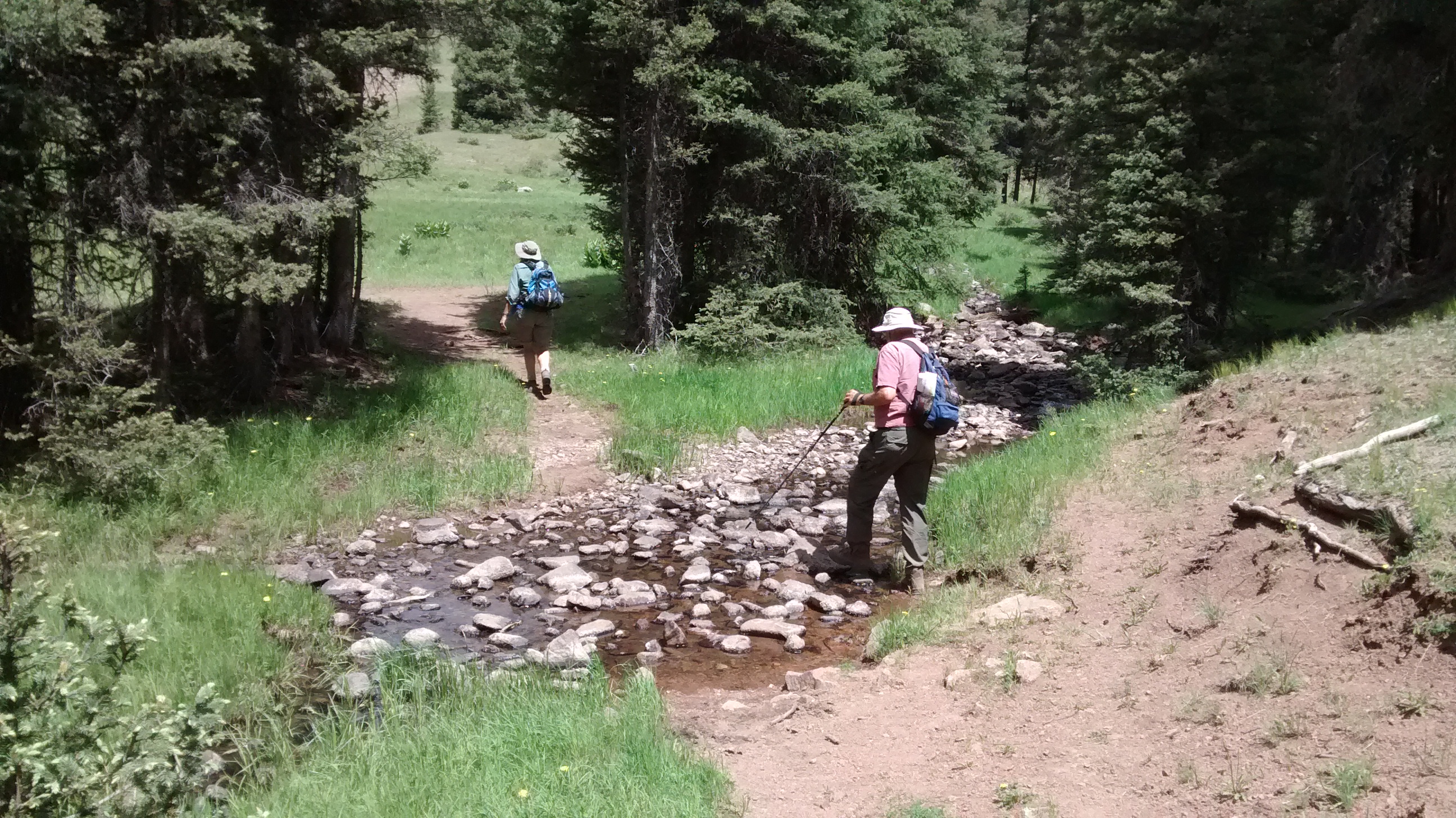 The leaders put their heads together and consulted their Santa Fe National Forest map and came up with an alternate plan. We did some backtracking and found another trailhead that is used by the group on other hikes. Not only did we get a beautiful 7.5-mile hike out of the deal, but the leader collected the GPS data, the driving data, and a hike description that can be used to create a new hike for the seniors to do in this area.