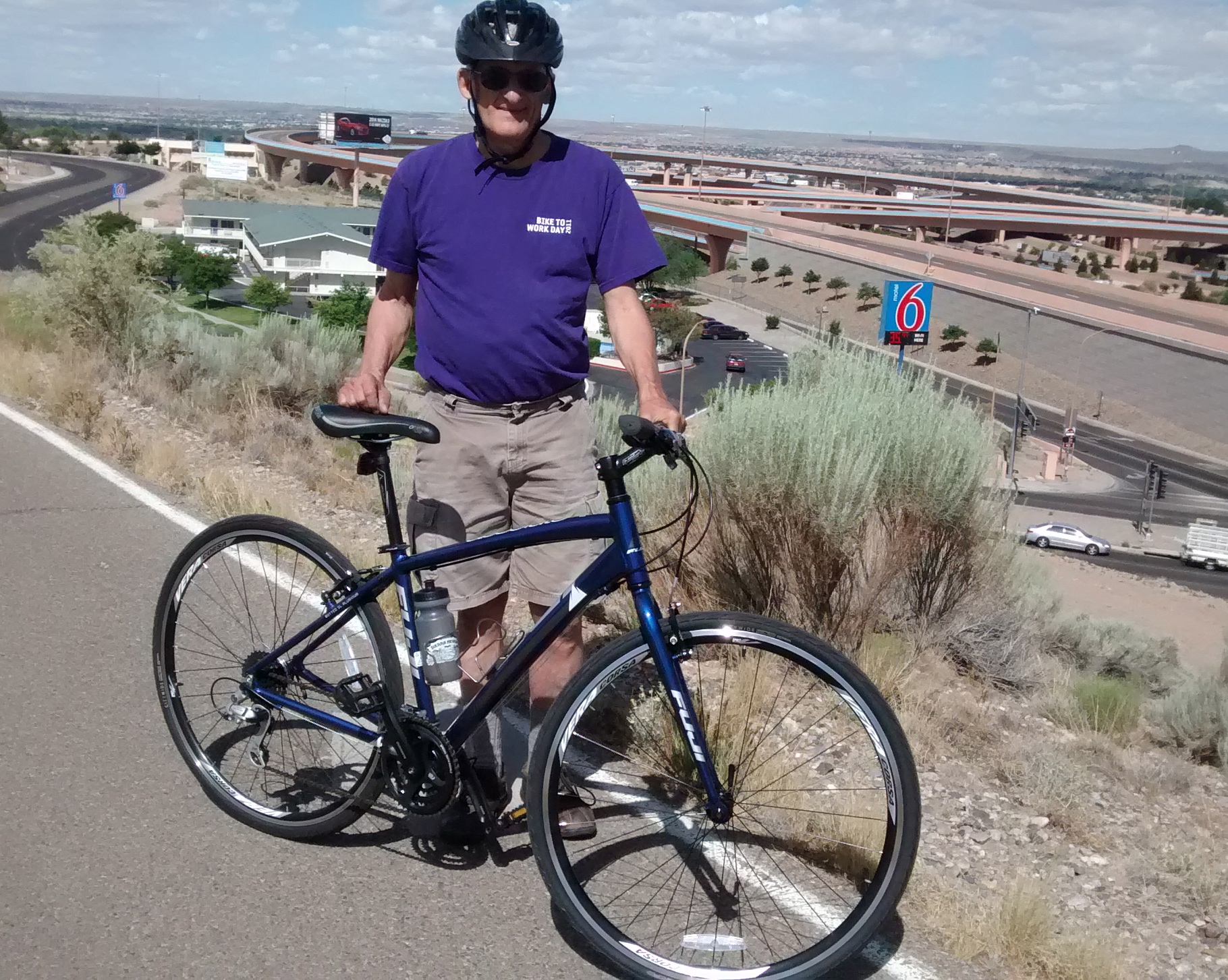 If you look at the map of our ride you see that it was 10 miles to get to the campus, and since we made it a round trip, it was a 20 mile bike ride. Also, on the map you can see how the bike trail crosses and then parallels Interstate-40, near what’s known as the “Big-I” because it’s the intersection of Interstate-40 and Interstate-25. It’s one of the sections of the trail I especially like because it makes you feel like you’re flying right above one of the busiest parts of the city. The “Big-I” is in the background of the picture above, although it’s hard with a phone camera to capture the panoramic view.