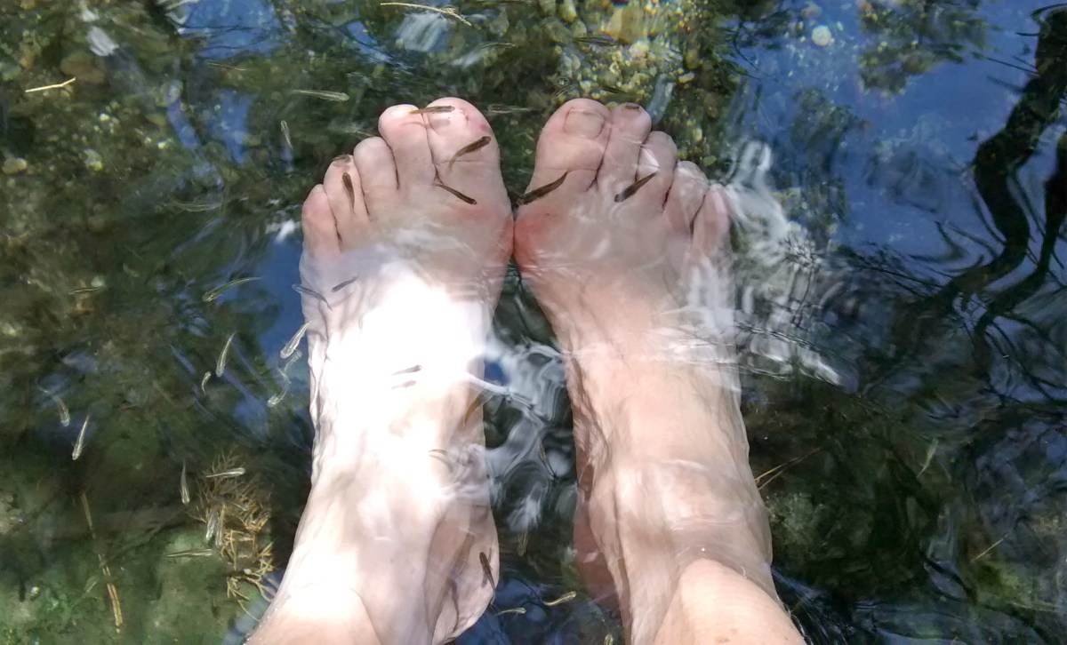 My feet are soaking in the refreshing waters of McCauley Warm Springs. There are some strange-looking black things over my toes and surrounding my feet in the water. Those are tiny little minnows that were swarming in the pools at the spring. Not only did the water sooth my tired hiking feet, but I also got tickling massages as the curious fish nibbled my toes!