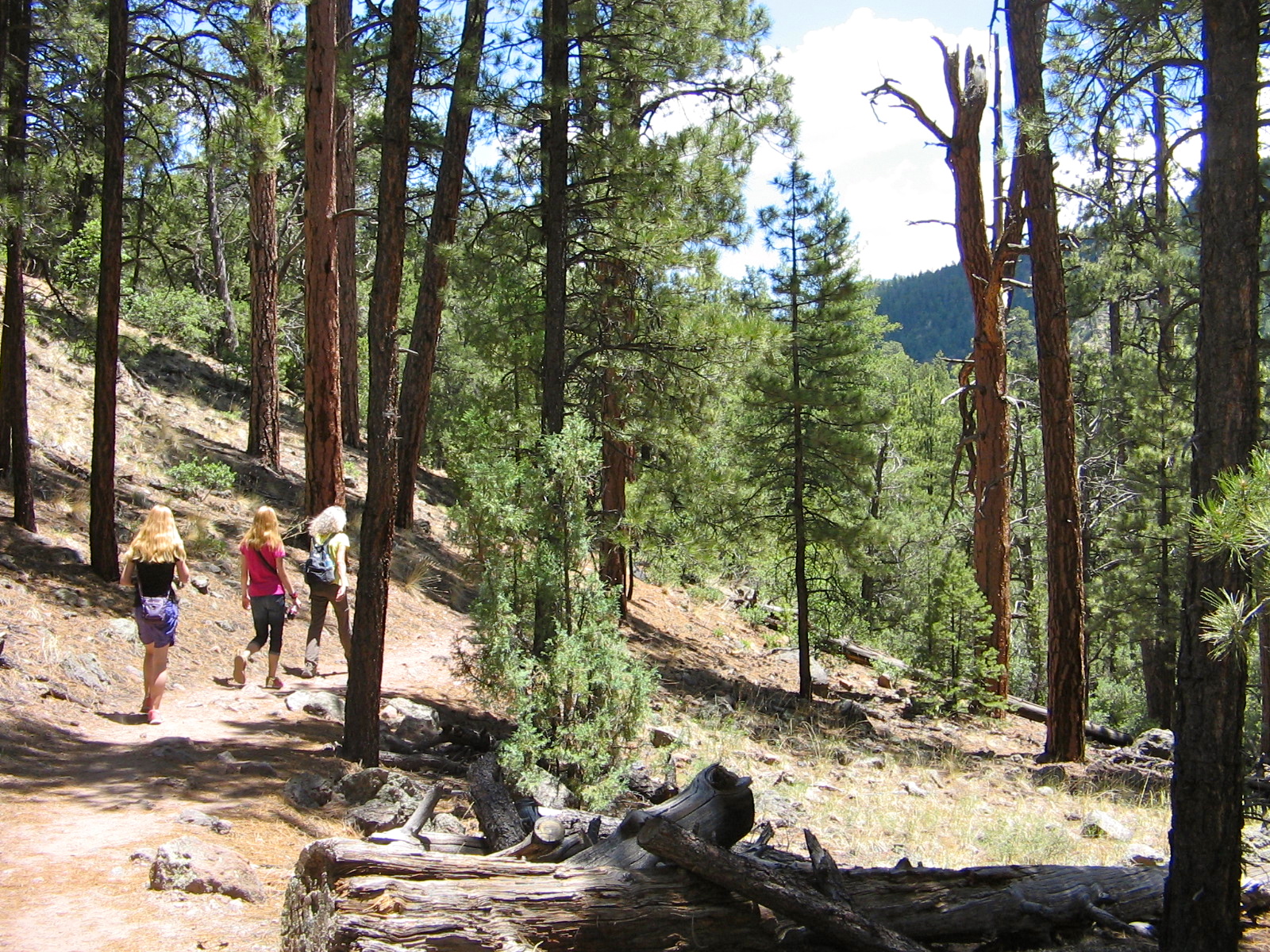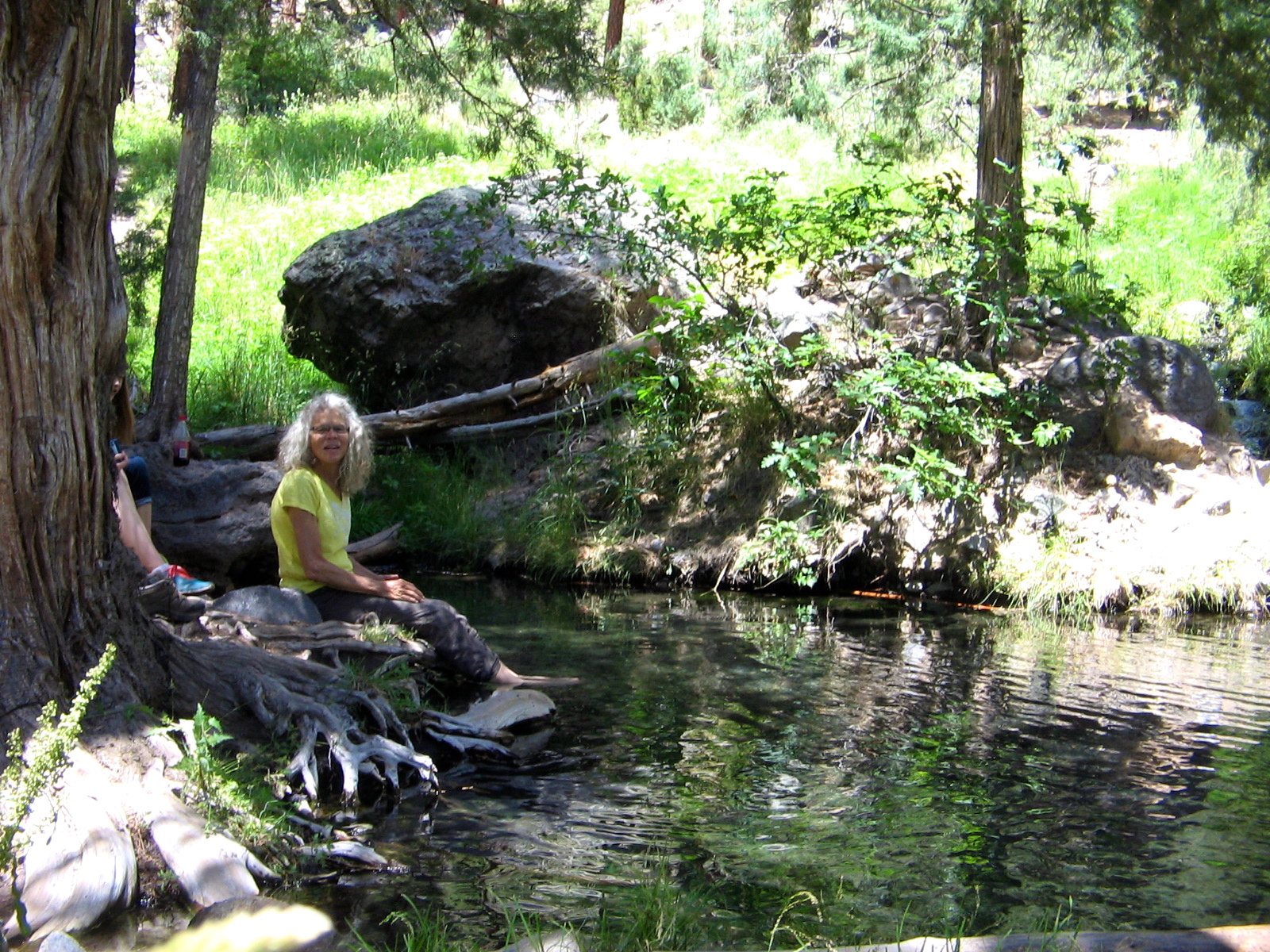 After driving as far as the boundary of the Valles Caldera, with a stop at Soda Dam, we backtracked to the Battleship Rock Picnic Area. Beneath this towering rock formation, the East Fork Jemez River and San Antonio Creek converge to form the Jemez River. A two-mile hike up the East Fork leads to McCauley Warm Springs, which was the destination for our hike today. We had never been on this trail before and didn’t realize that it was 2 miles of continuous uphill. But the girls trudged right along and didn’t complain at all. Our efforts were rewarded when we reached the refreshing spring. And we knew that it would then be all downhill to get back to the car.