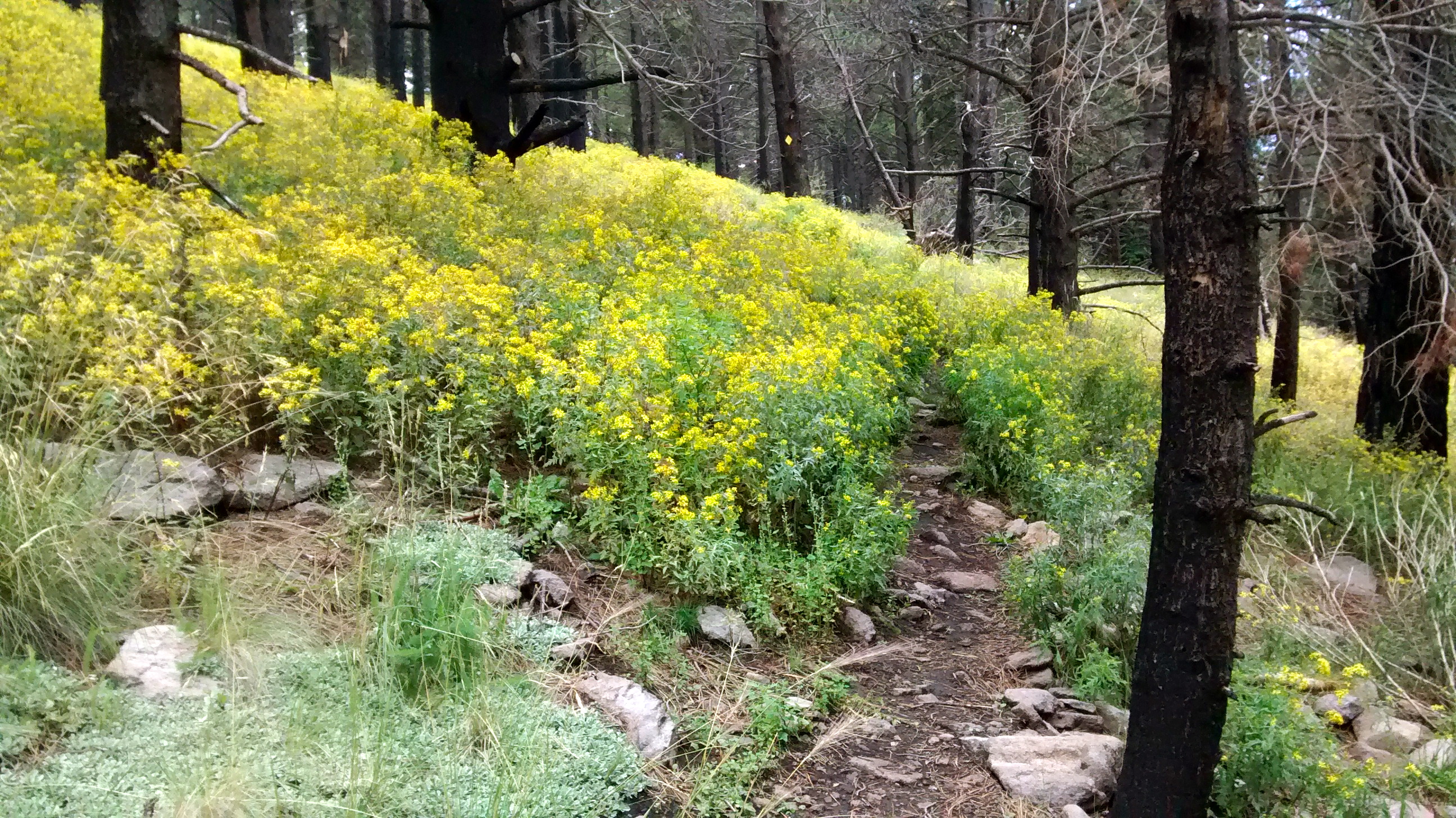 Patches of bright yellow wildflowers contrasted with blackened tree trunks.