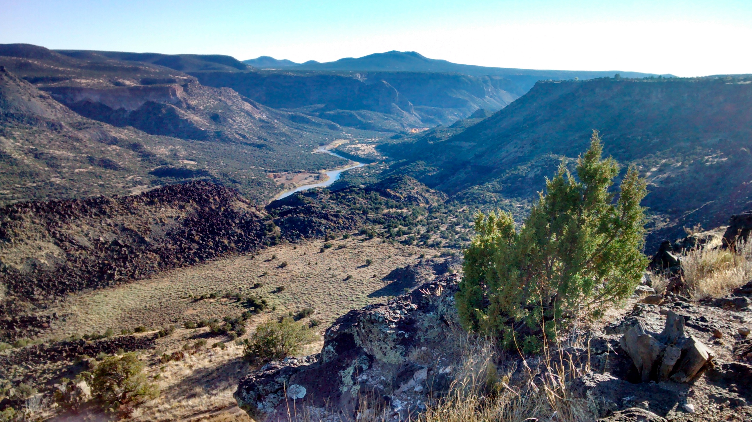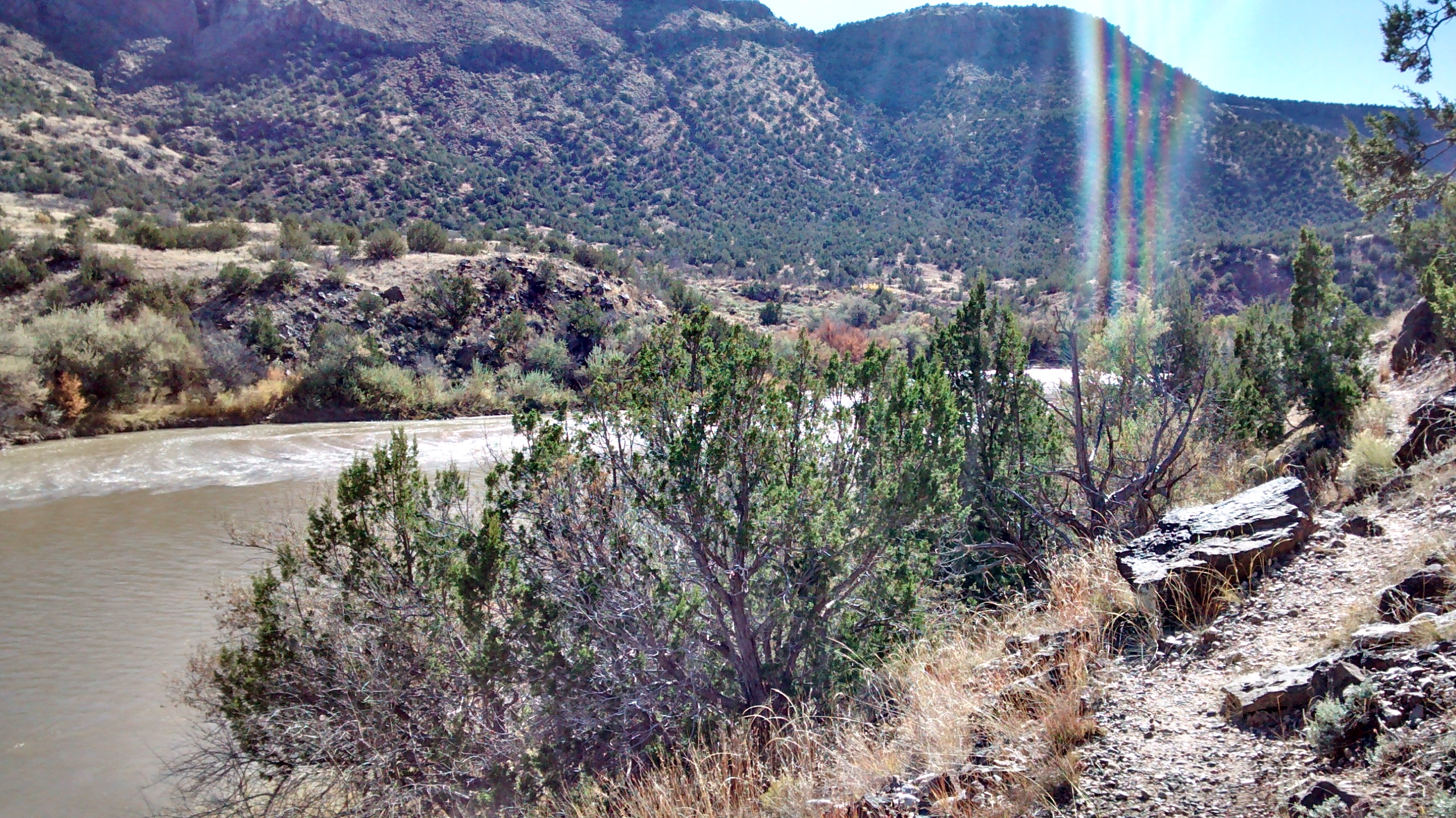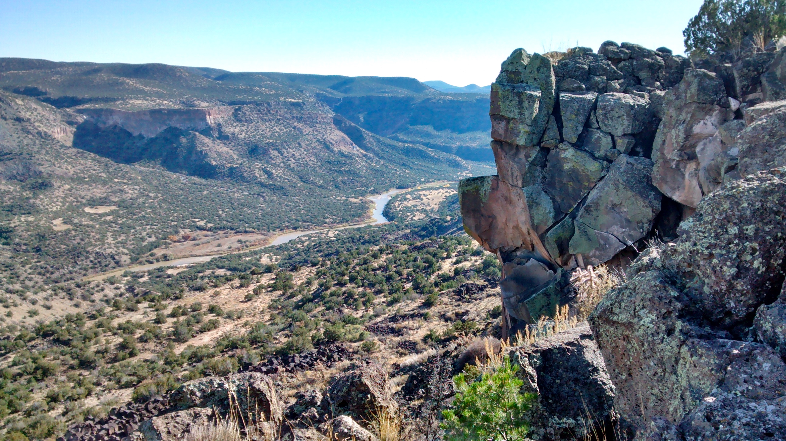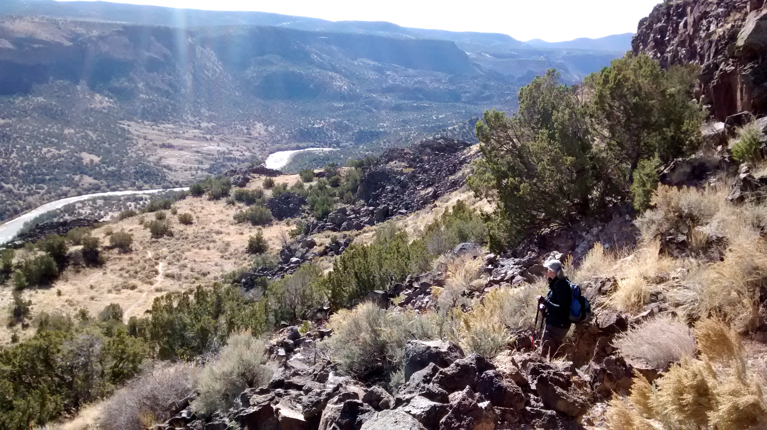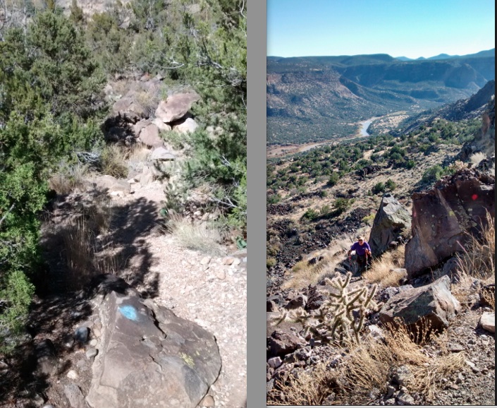 About an hour-and-a-half drive north of Albuquerque, the small town of White Rock, NM, perches on the edge of a gorge overlooking the Rio Grande River at White Rock Canyon. A public access viewpoint at the edge of town is a spot that Lee and I visited a couple of months ago. As we gazed down at the river far below us, I knew that this was a place I wanted to come back to when we had more time and could hike the trail that leads down into the canyon. Actually, there are 2 trails, one marked with painted blue dots on the rocks along the trail and one painted with red dots. Combining these two trails with a connecting trail at the bottom and another trail at the top along the canyon rim makes a nice 7.5-mile loop trail. Today was the day that we got to connect the red and blue dots and check this trail off our bucket list.