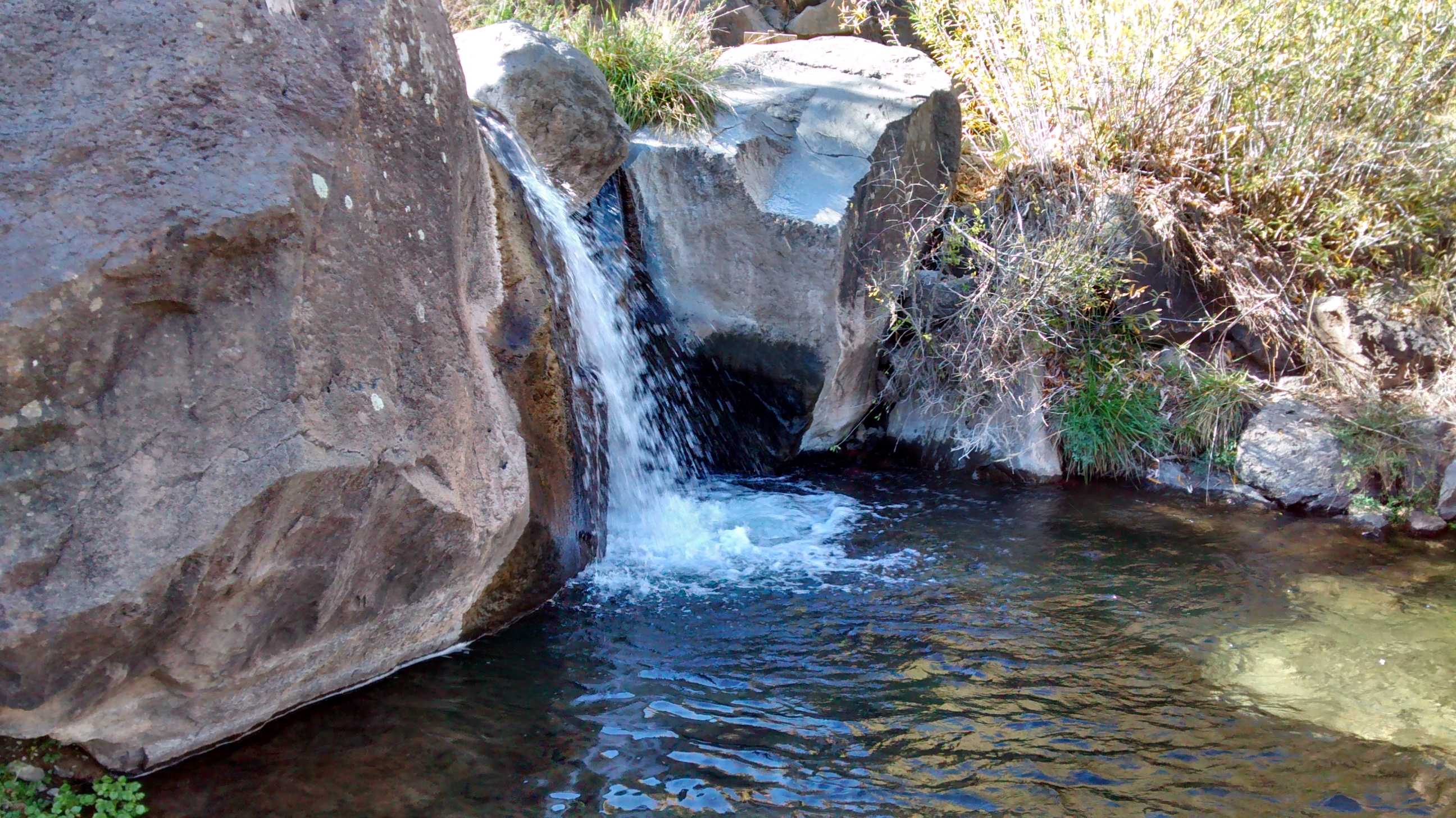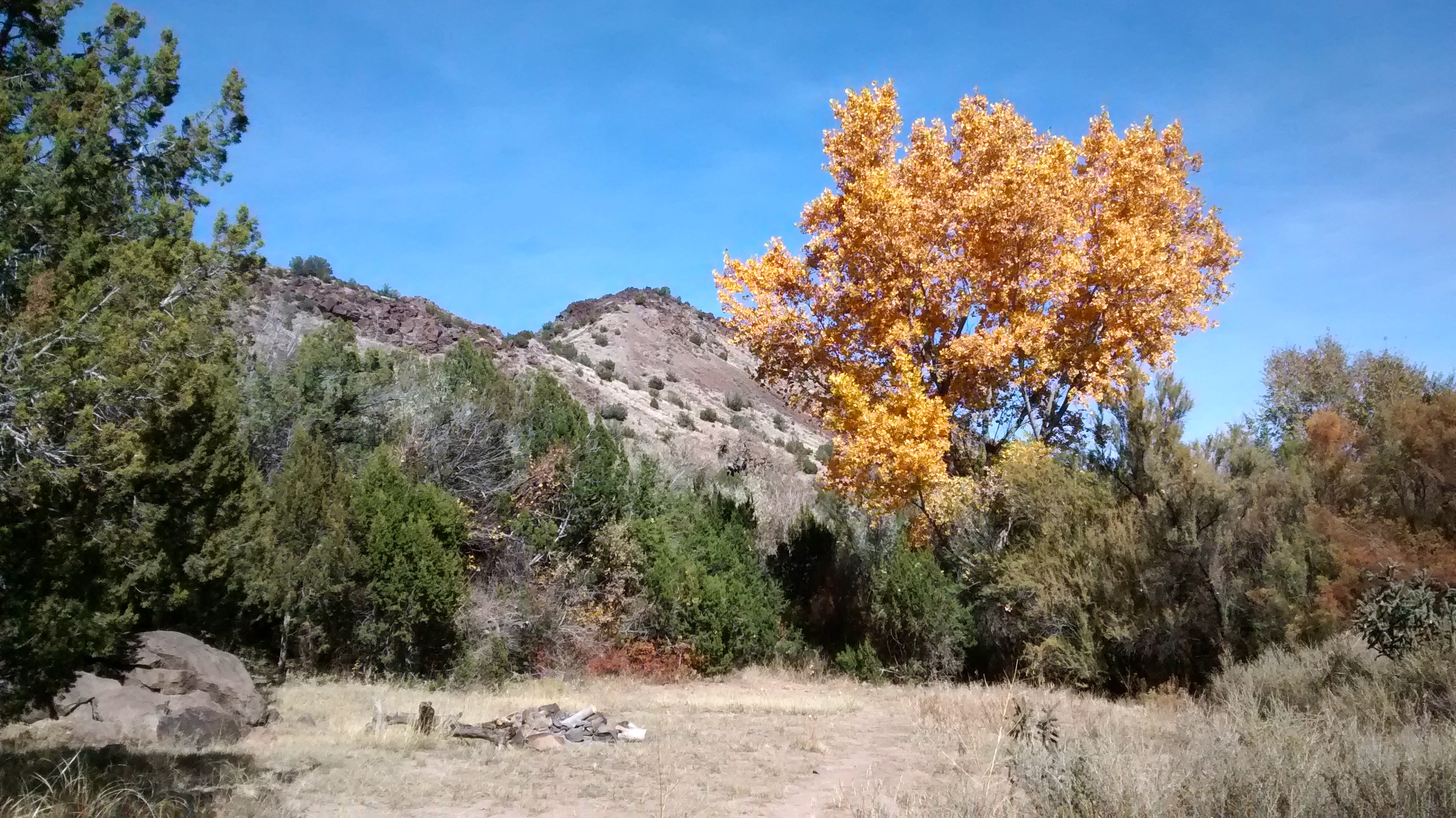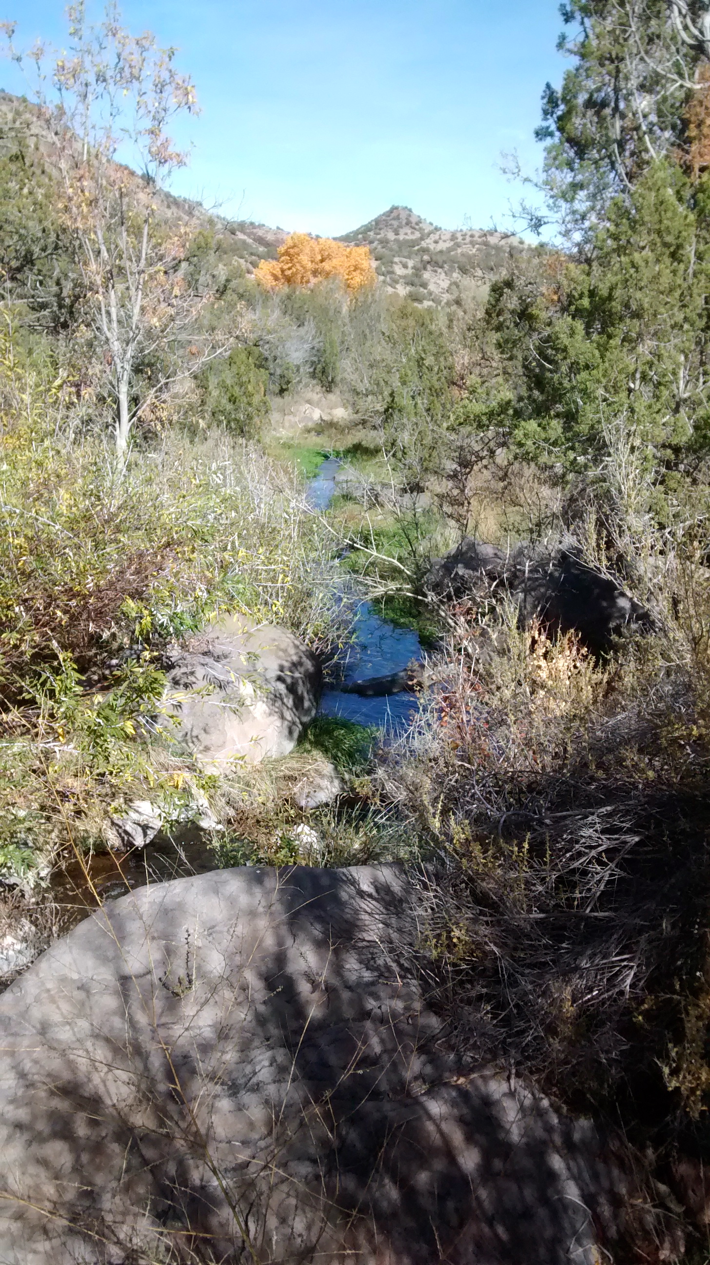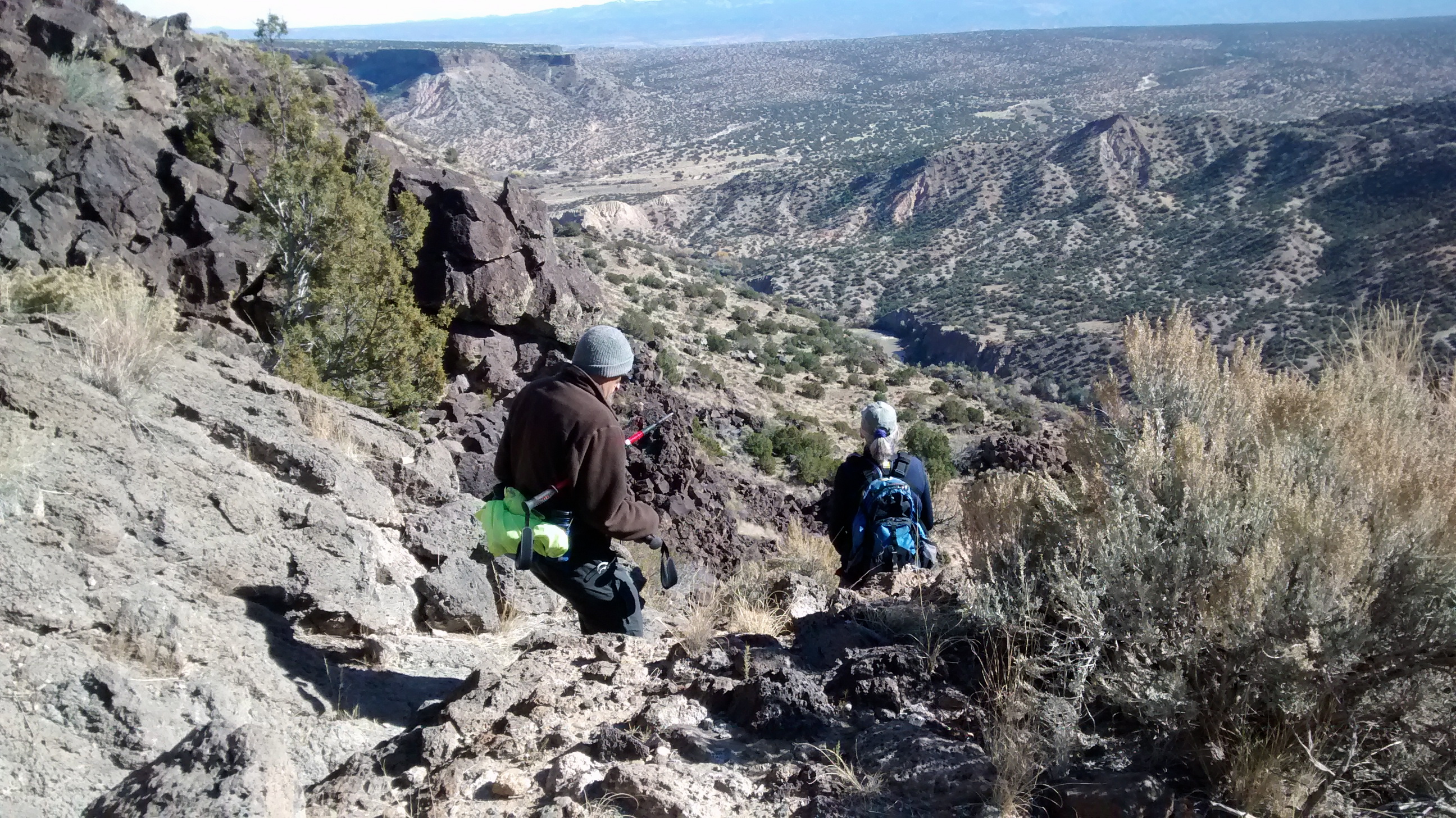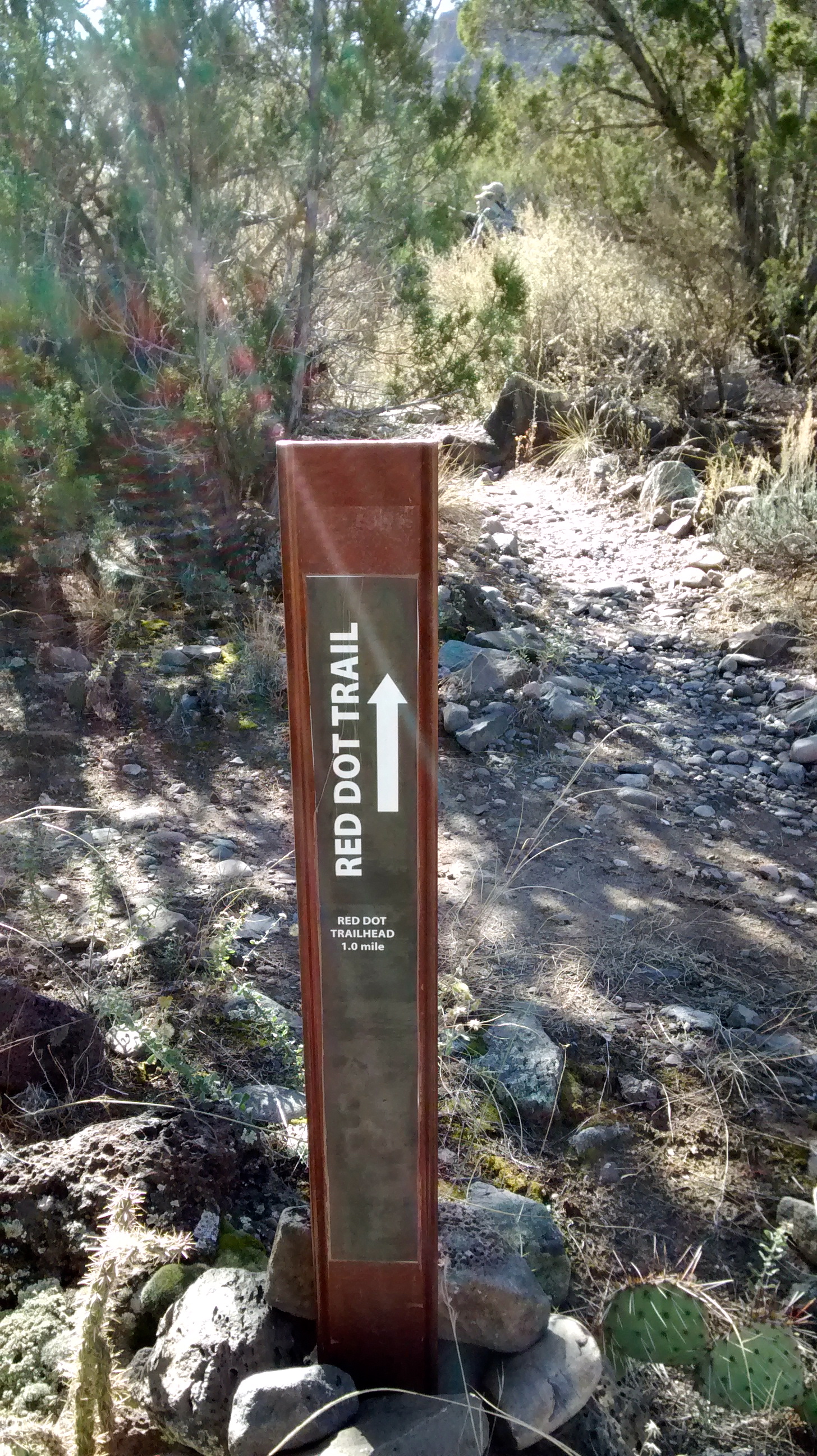 Our starting point was the Blue Dot trailhead, which drops steeply down for about a mile to meet the River Trail, about 1000 feet of elevation drop. Following that trail for about two miles led us to our lunch spot at the refreshing outflow of Pajarito Springs, also the point where the Red Dot trail starts back up to the canyon rim. We definitely needed the fuel provided from lunch to make that 1-mile ascent back up to regain the 1000 feet of elevation.