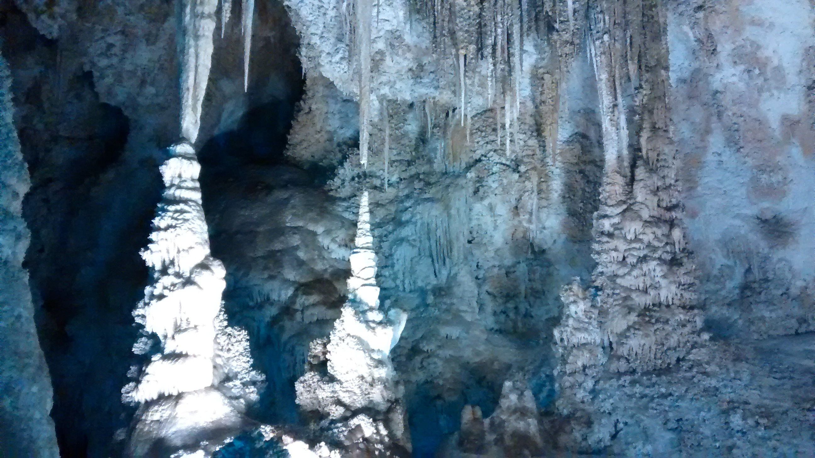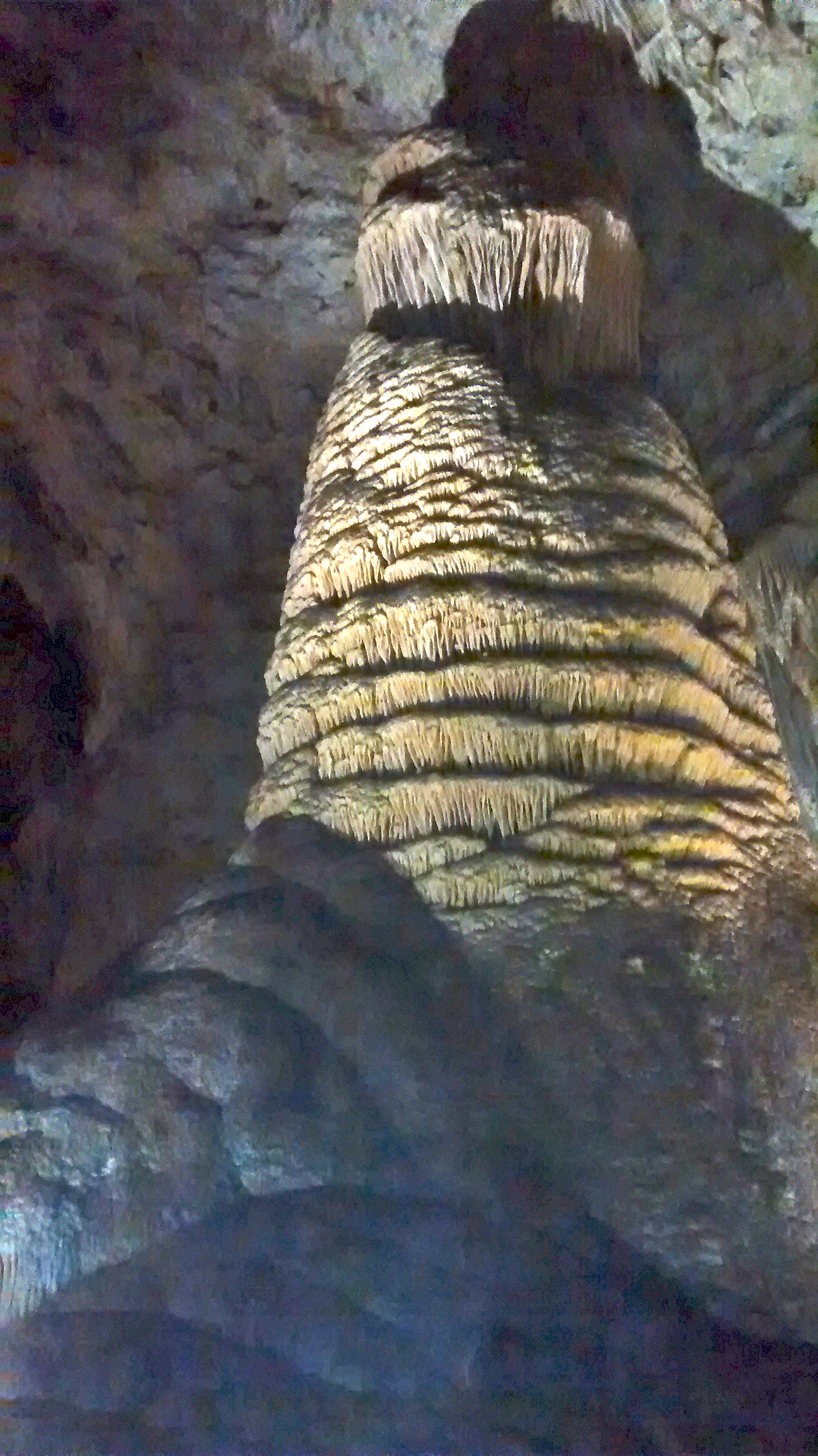 Although there is an elevator that takes you from inside the Visitor Center down into the main area of the caverns, it’s more fun to walk in through the natural entrance and follow the long, spiraling aspalt path as it winds its way to the bottom. We made a quick dash outside the visitor center on the trail to the natural entrance and were soon in the quiet, dry confines of the cave. The huge calcium-carbonate cave formations are awesome, but I think it was the experience of the stillness and quiet as you walk through the caverns that impressed me the most.