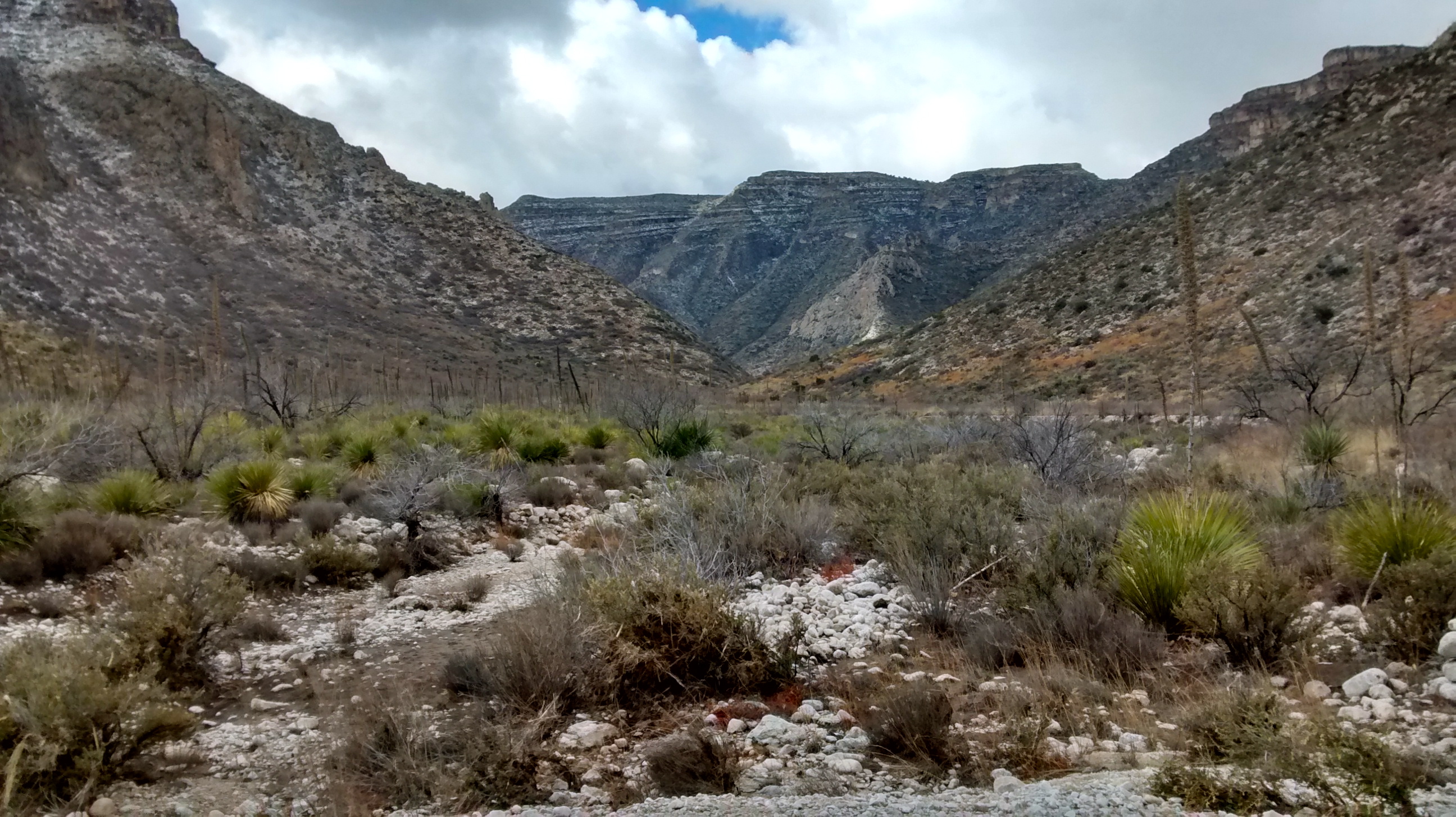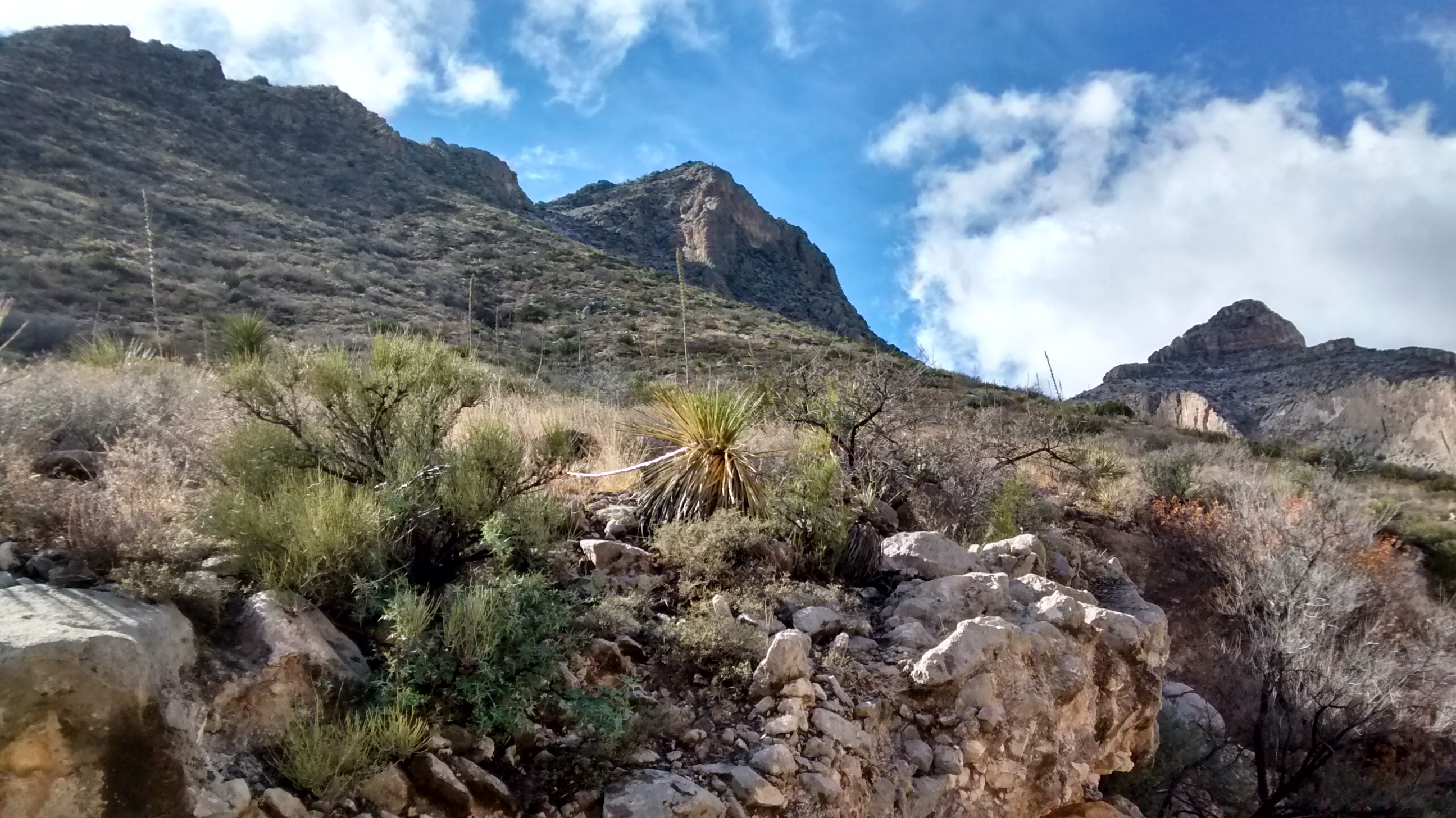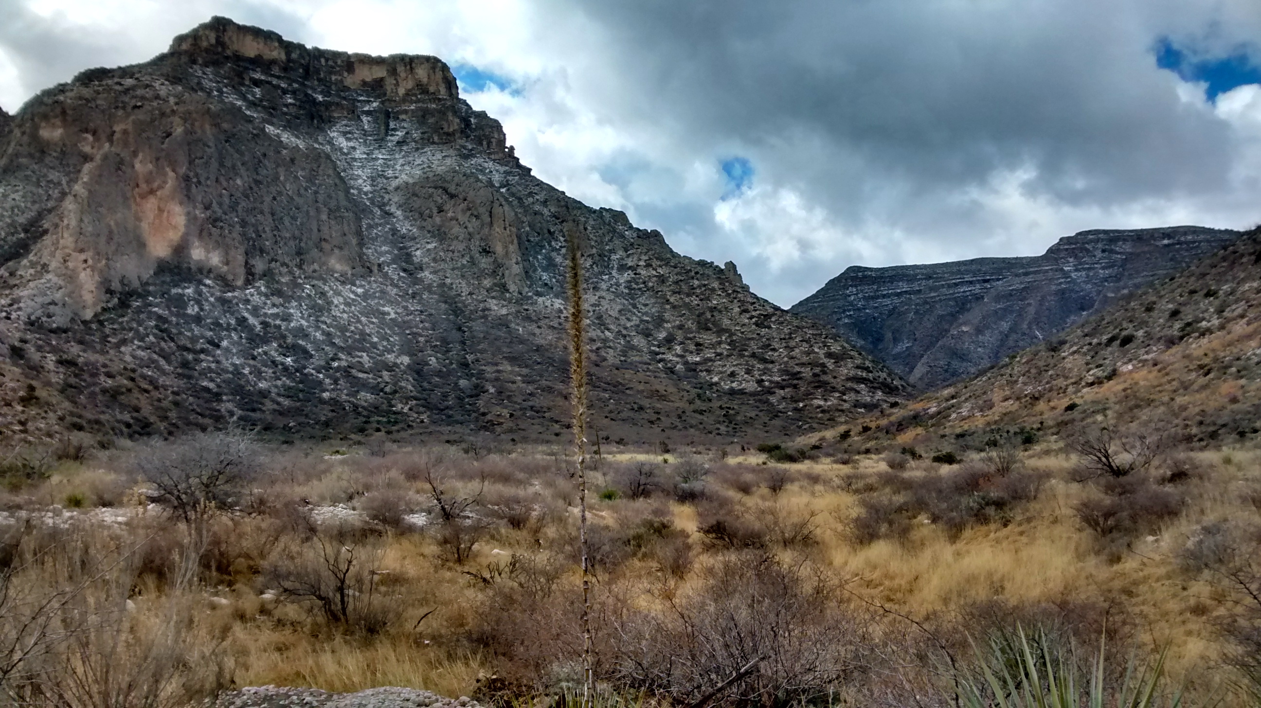 After a couple of hours gawking our way around the Big Room cave chamber we took the elevator back to the top. We were happy to see that the storm clouds were breaking up, which meant we could now drive up to the mountains and do our planned hike in Slaughter Canyon. There wasn’t enough time to go as far as originally planned, but it was still a good hike and gave us a sense of what the Guadalupe Mountains are like. We will definitely be taking another trip to that area for camping and hiking at a warmer time of year.