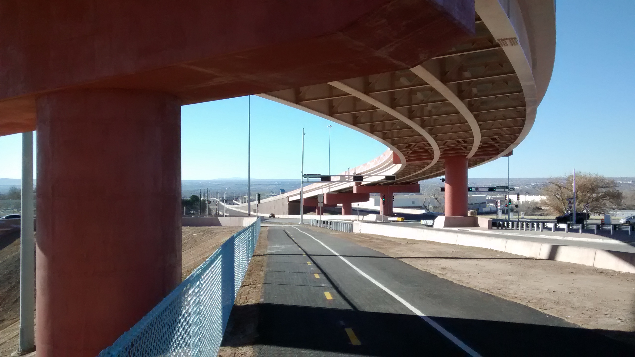 Today was a break in winter weather and we took the opportunity to ride our bikes over the section of the rebuilt interchange that was specifically constructed to allow bicyclists a safe way to cross Interstate 25. There had been no way to do this before in that part of town and, for us, it provides a new connection to some of the bike trails we like to ride on the east side of town.