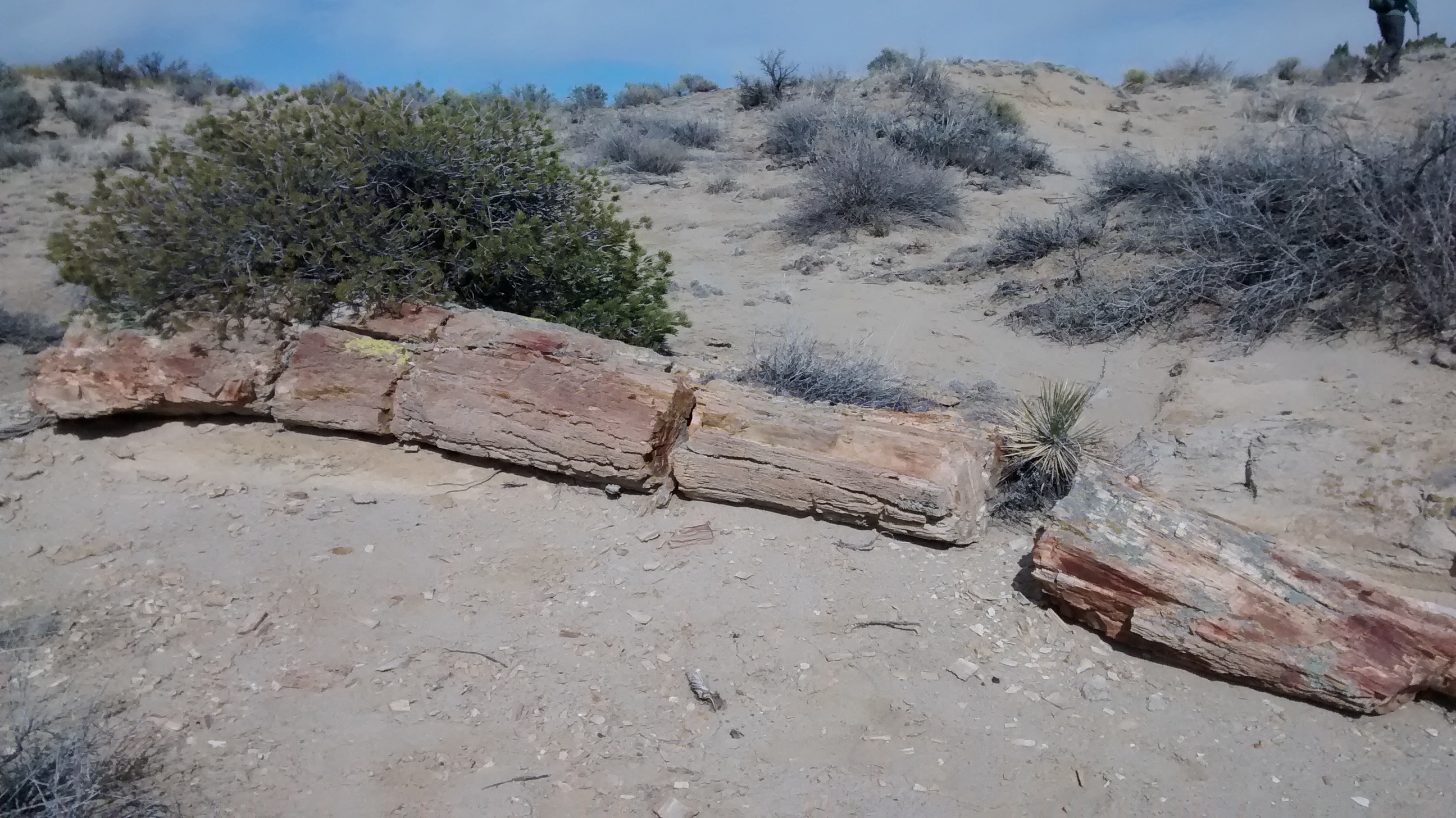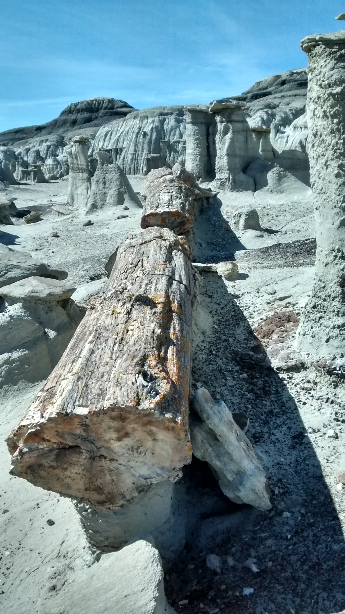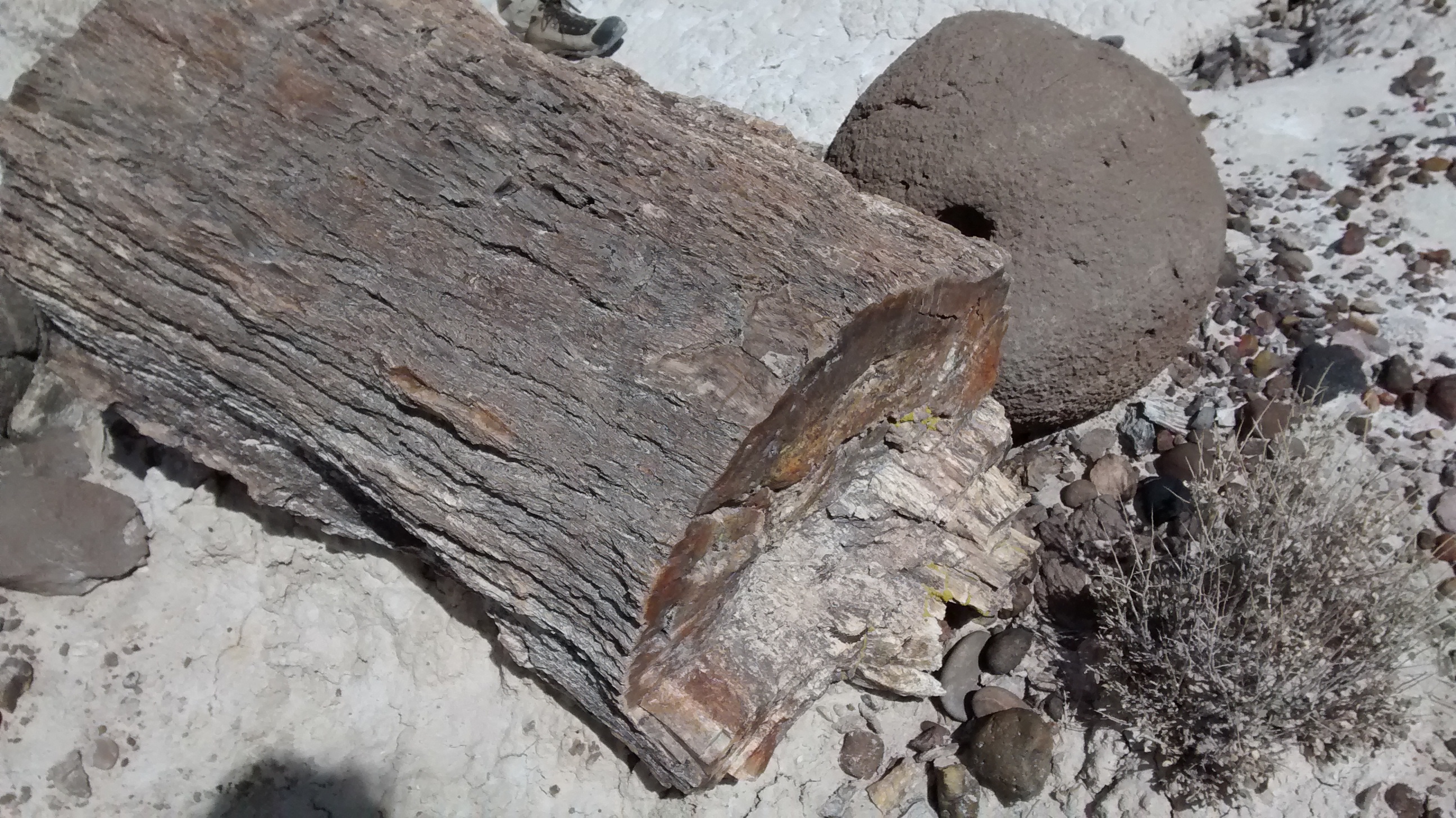Besides rocks eroded into weird shapes, both areas have amazing examples of petrified wood logs and splinters scattered everywhere. Here are photos of some of the petrified logs. Trying to photograph the piles of petrified wood chips and splinters didn’t give a sense of the detail, but the logs are quite impressive, some of them over 50 feet long.