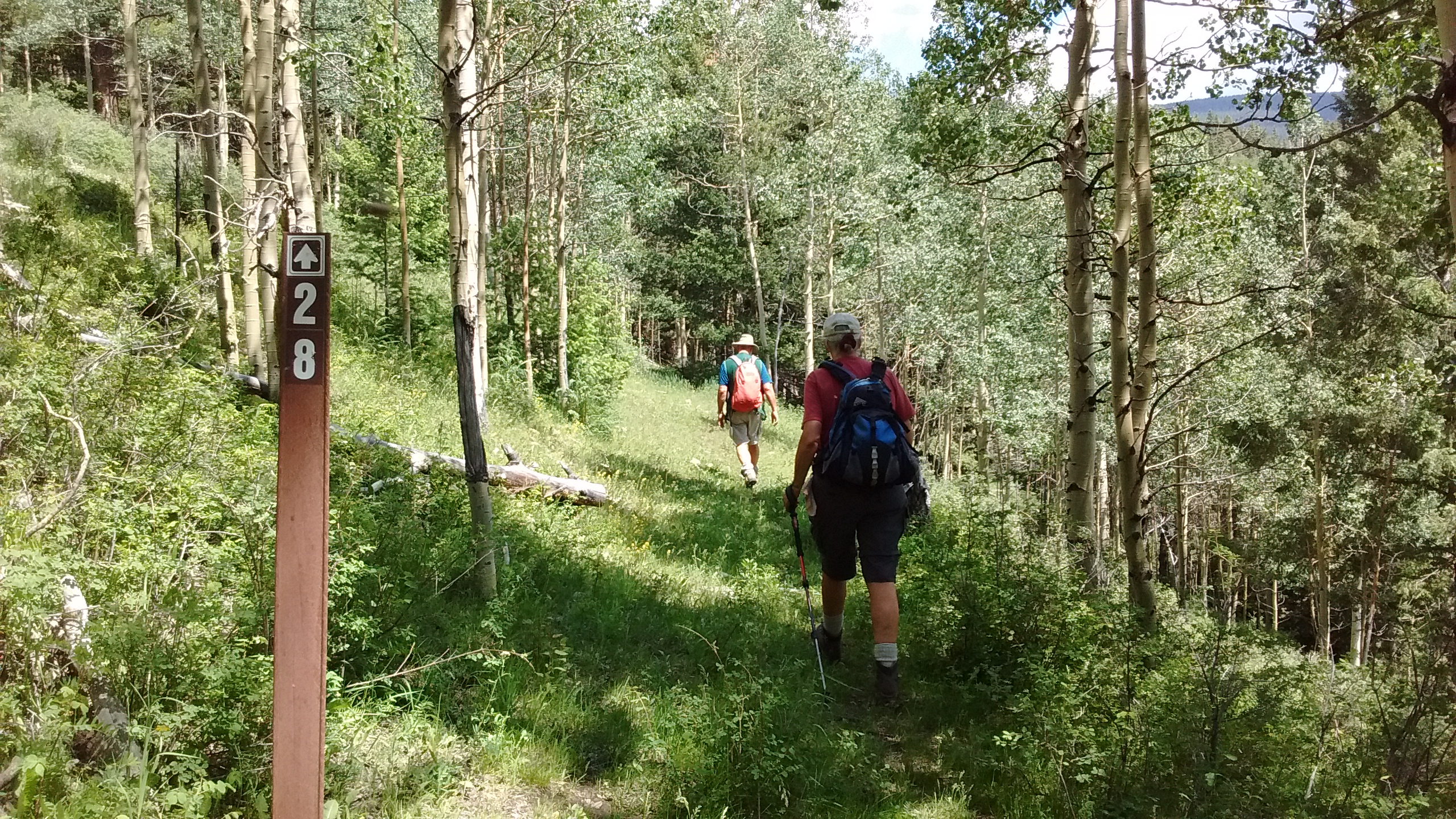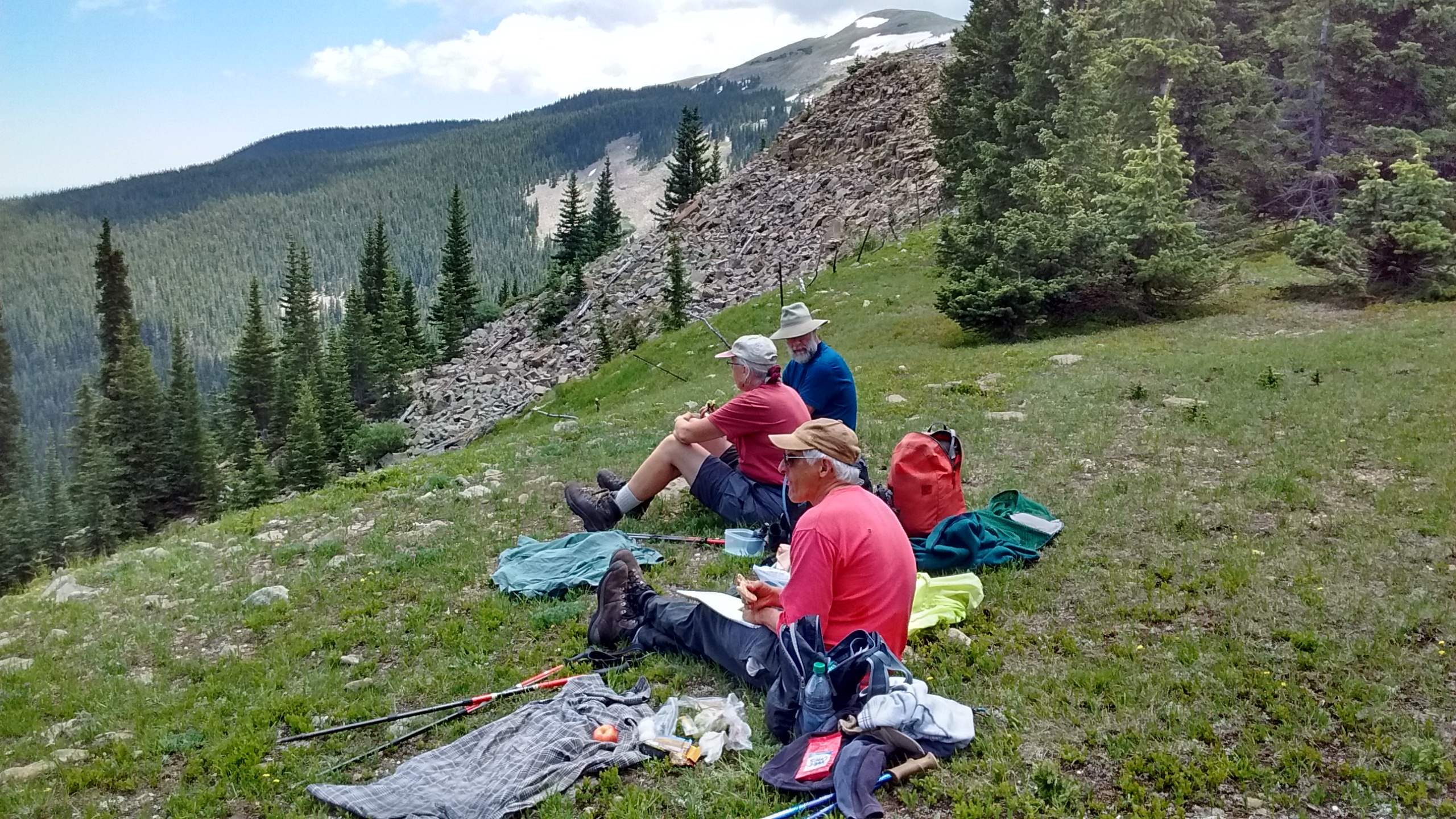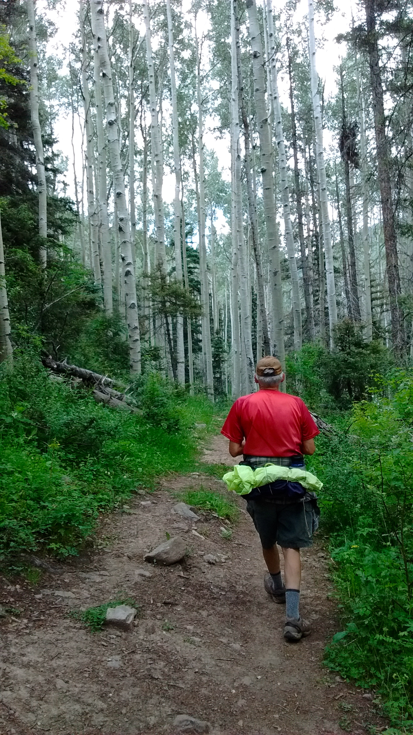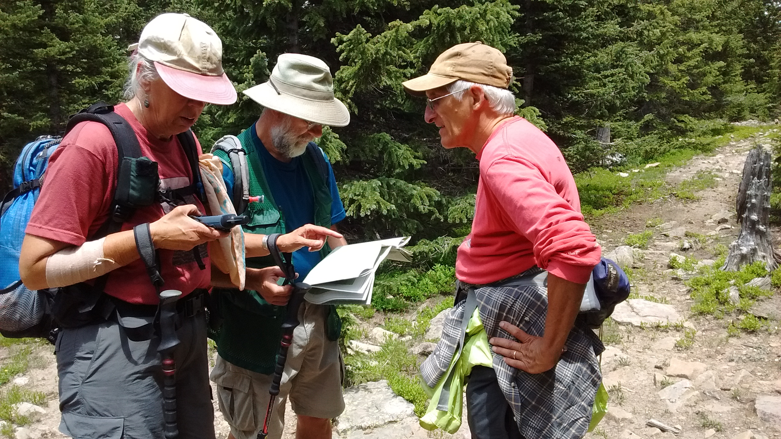 The second major challenge of Tuesday’s hike was trying to reconcile trail signs with names and numbers and maps we had of the area. Our goal was a ridge called Ripley Point, about 5 miles east of the campground at an elevation of 11,800 feet. The campground was at 8,800 feet, which meant 3000 feet of elevation to climb in the 5 miles. After about 2 miles of hiking, we started up what looked like a connector trail on the maps and GPS but turned out to be a brutal bushwhack straight up for at least a mile through thick woods before we finally connected with a real trail.