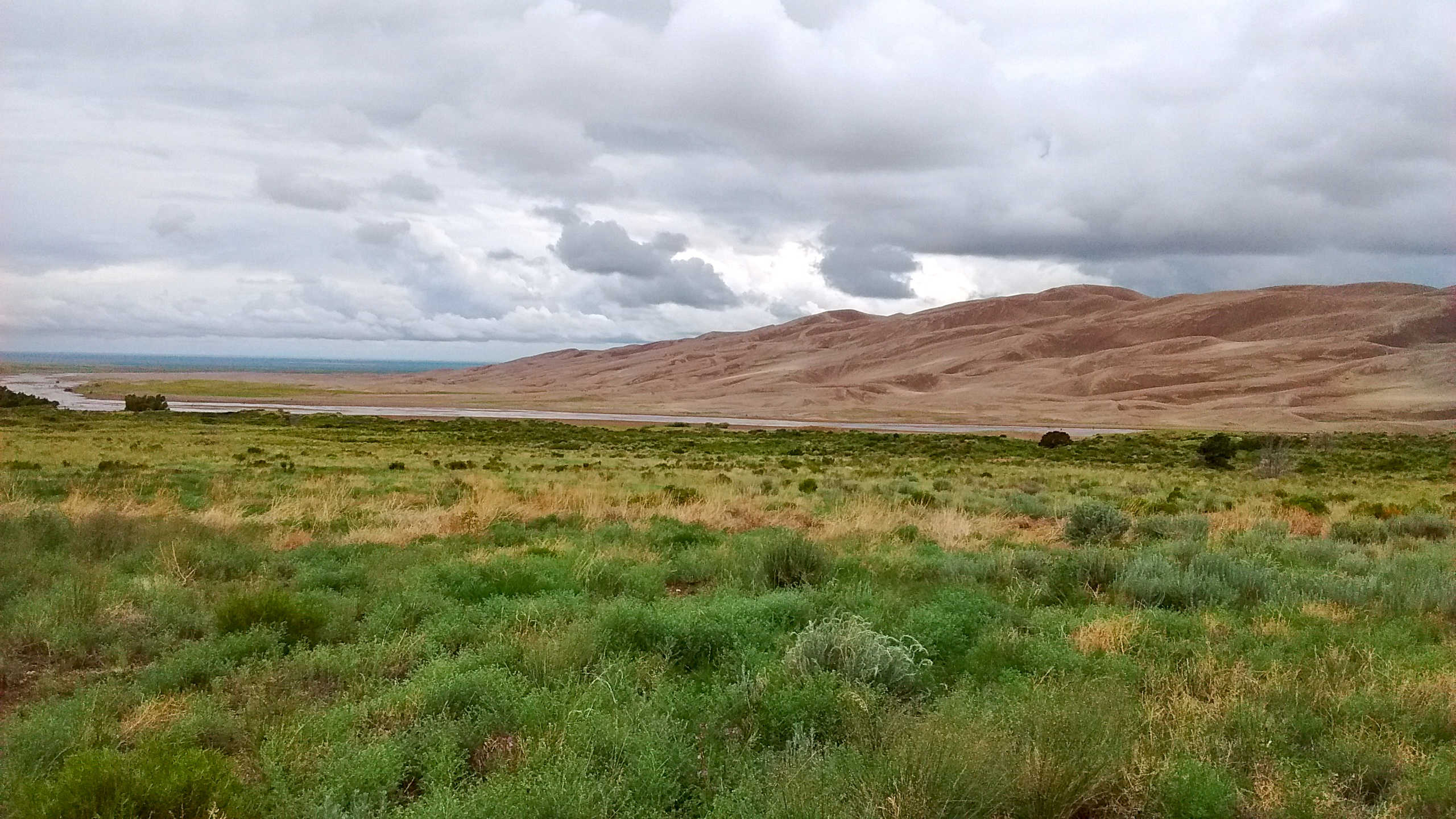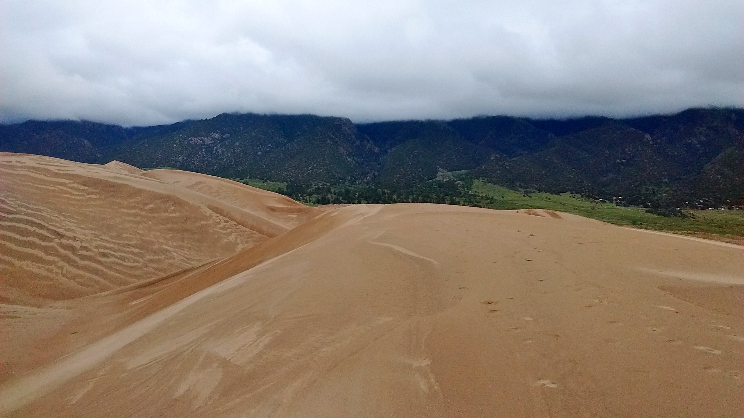 Throughout the night Monday we were periodically awakened by the sound of rain and thunder. Although we stayed dry in our tent, by the next morning it was obvious the day would be too cold and wet for the hike we had planned in the nearby mountains. Instead, we drove back south about 50 miles to the San Luis Valley, where we spent the day exploring Great Sand Dunes National Park. It was cloudy all day, even in the valley, and the temperatures barely warmed up to 60 degrees.