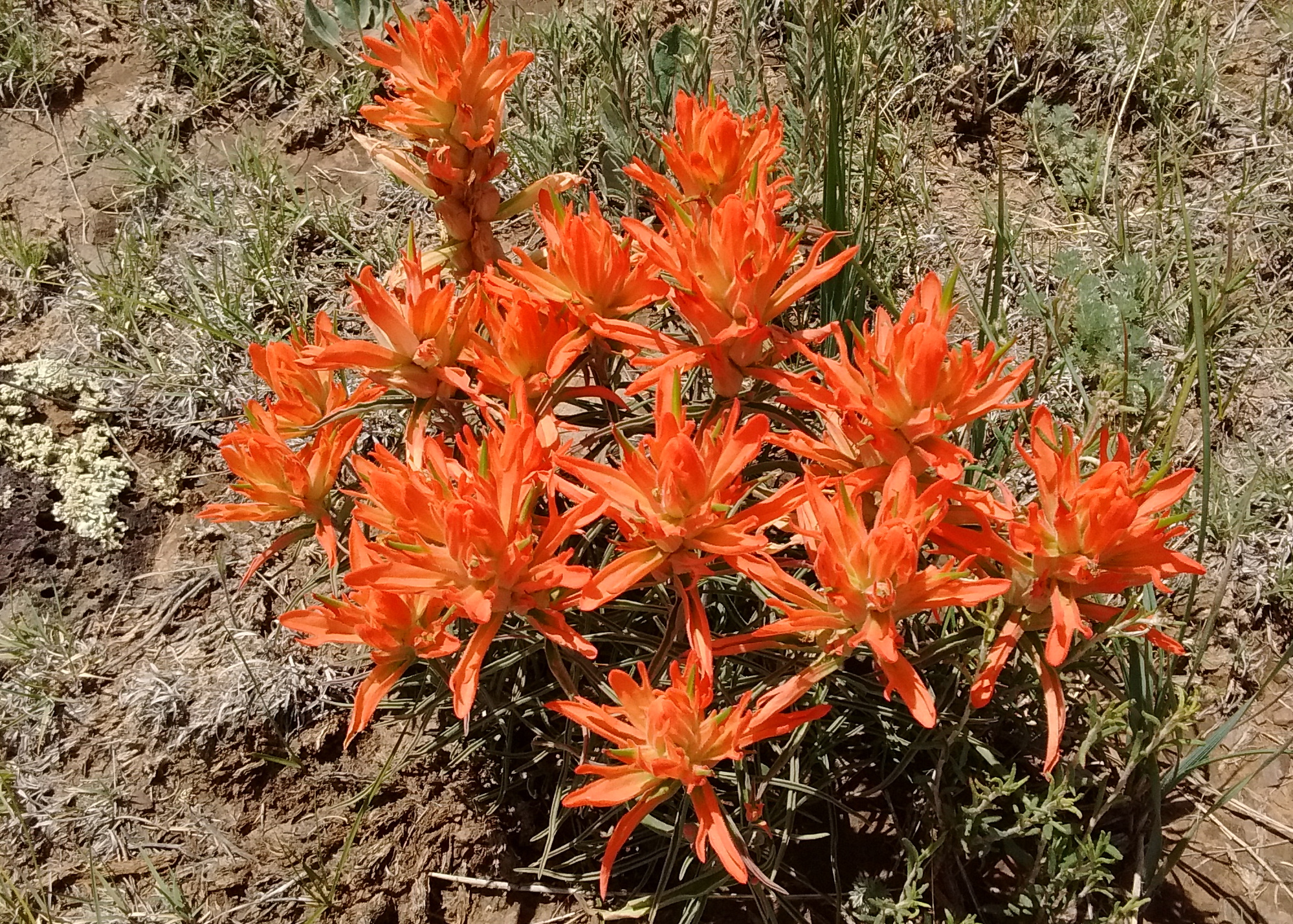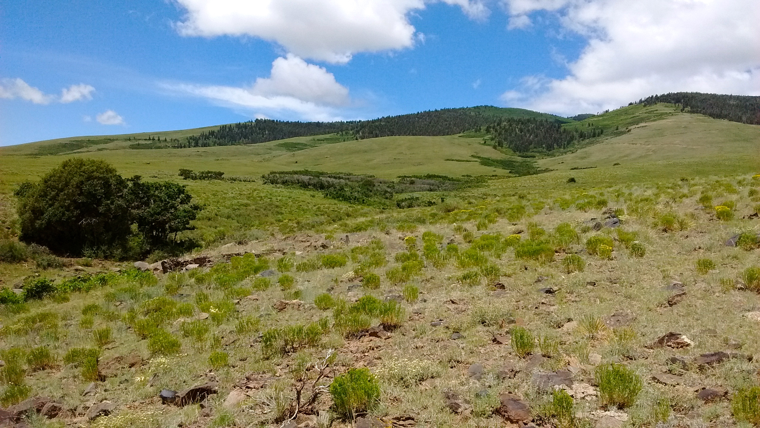 The one road access from US285 dead ends at a fence with a closed gate, blocking the way to the private land. We parked our car by the gate and then began our trek around the private land and up the grassy slope of the mountain. We didn’t make it all the way to the top, but had a good time looking at wildflowers and the views to the east. All that open land and blue skies was a nice welcome back to New Mexico.