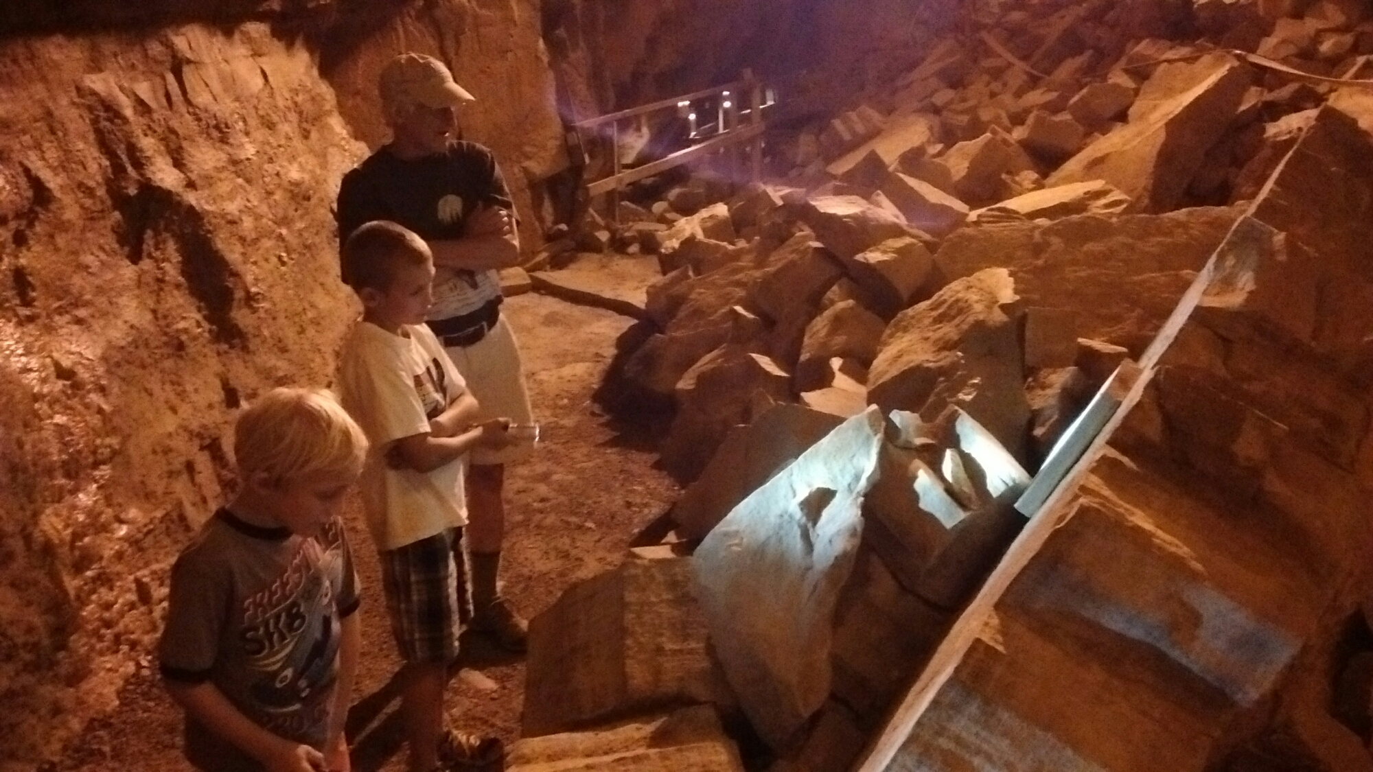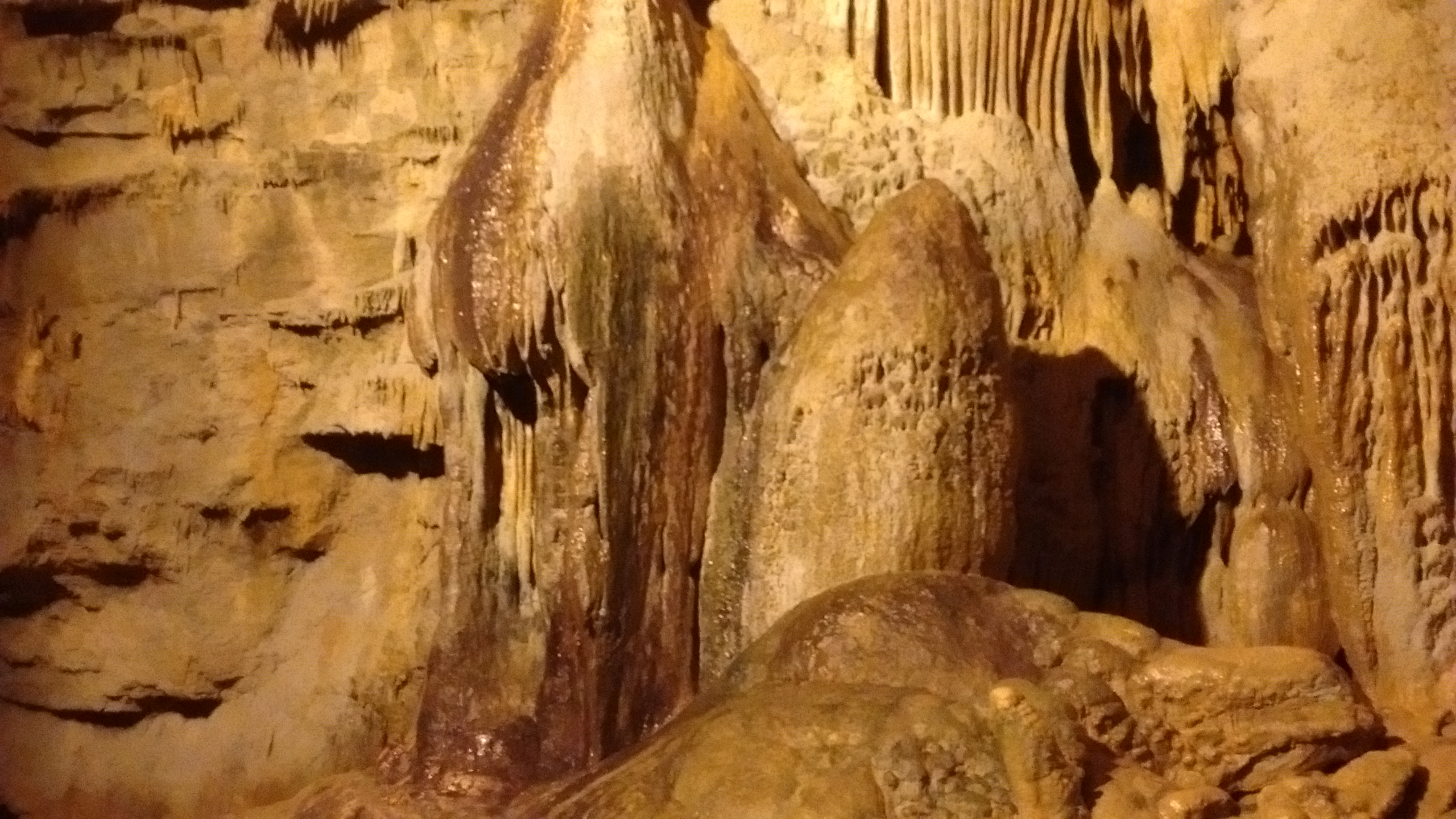 Besides gazing up at cave formations, we also got to shine flashlights down into holes and passageways filled with unknown mysteries. One hole we were particularly interested to peer into was the one in the center of the cave where the sign explained how the cave had been discovered in 1942. For years before that discovery, the farmer who owned the surrounding land had been making use of a hole in one of his fields as a convenient place to dispose of animal carcasses and other debris. He didn’t know how deep the hole was but knew it was deep enough that he couldn’t hear things hit the bottom. When some cave explorers heard about the hole and talked to the farmer he said they were welcome to check it out. Letting himself down the hole with a rope, one of the men reached the 120 foot bottom, and was excited to discover that he was in the middle of a vast underground cavern.