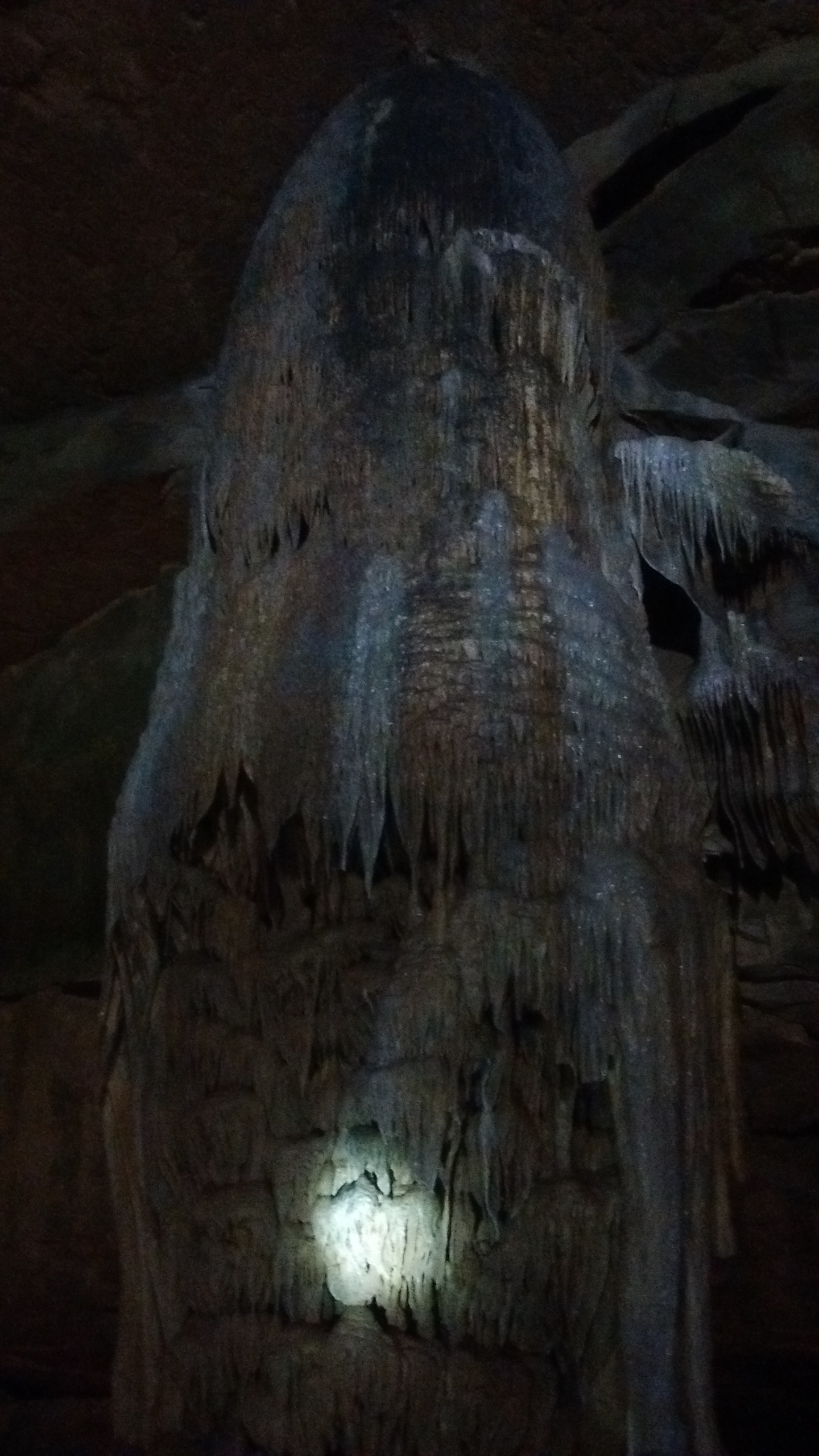 Reading the signs as we walked through the Lost World underground caverns at Lewisburg, WV, I knew I could refresh my memory of stalactites versus stalagmites, but I didn’t expect to learn that there was a World Record for “stalagmite sitting” and it was set right here at Lost World. As we stood gazing up at the 28-foot high stalagmite called The War Club, on which the event took place, it was hard to imagine who in their right mind would do such a thing. Bob Addis in 1971 spent 15 days, 23 hours and 22 minutes sitting on a small platform built on the 4-foot diameter peak of the column. I guess “flagpole sitting” was once a fad and maybe that’s where he got the idea. But thinking of all that time hunched in a cold, dark, drippy cave gave me extra shivers beyond what I already felt in the 52 degrees underground chill.