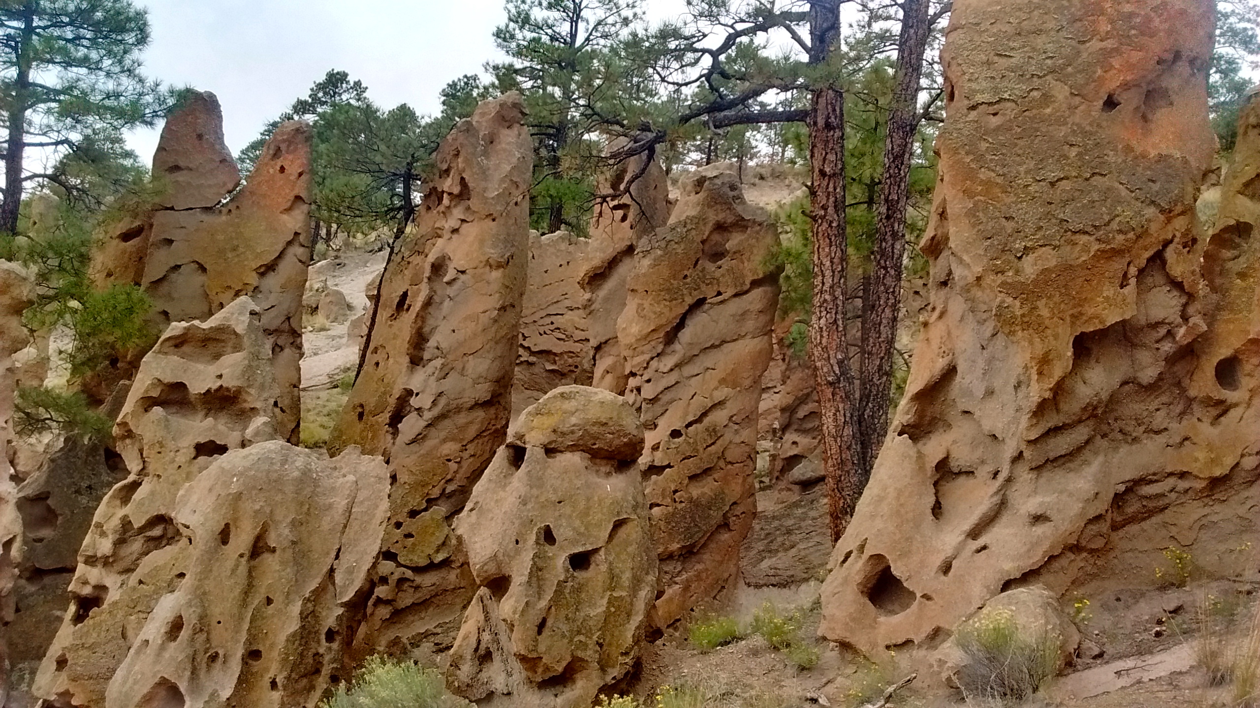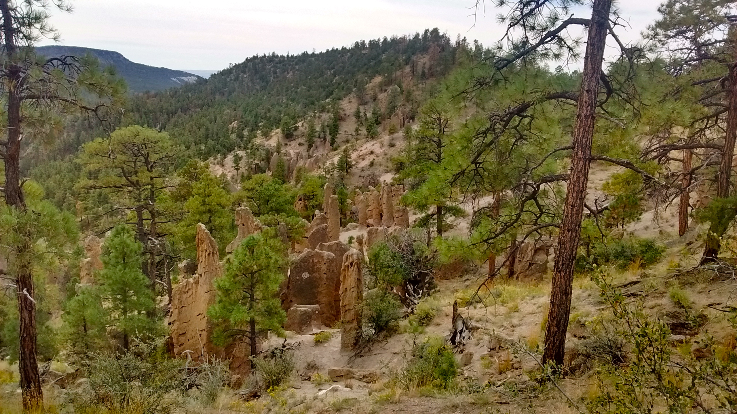 About an hour from Albuquerque, in the Jemez Mountains, there is a Santa Fe National Forest campground at Paliza Canyon and several dirt roads and trails in and around the canyon. There aren’t any formal trails so we were glad to have our friend, Sue, and her GPS device along to guide us. We were on our way to visit the rock formations called The Goblin Colony.