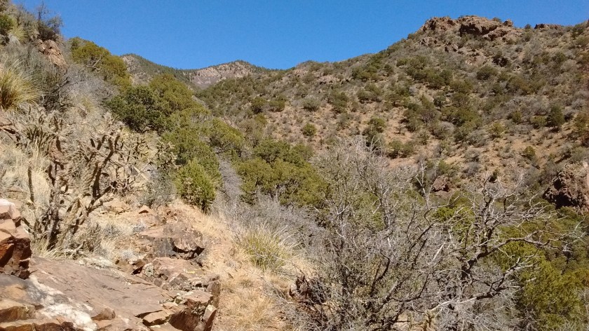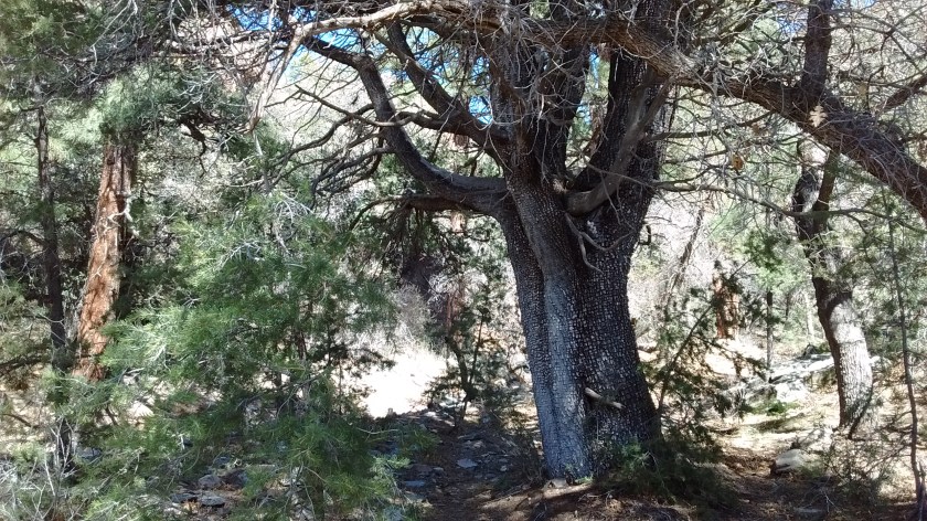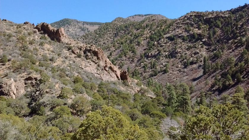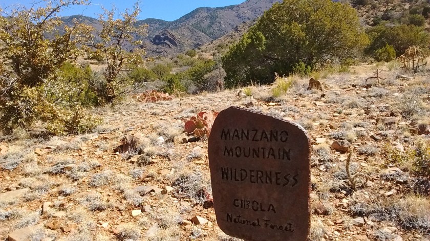 For our friends who are familiar with the Manzano Mountains, notice that the hike is climbing up towards the crest, about halfway between Manzano Peak and Gallo Peak. We’ve been up there on the crest before, but always by hiking in from the other side. Forest Service Maps do show a trailhead for Monte Largo Canyon, but not a trail. That seems strange because it was a trail that was fairly easy to follow, basically up the drainage of the canyon.