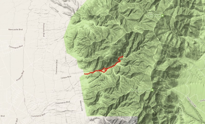 Monte Largo Canyon is on the west side of the Manzano Mountains, which we’ve hiked in before, but usually our hikes start on trails that are on the east side of the mountains. The west side of the mountains are reached by driving south of Albuquerque to Belen and then east. Below is a picture of our track on Google Maps.