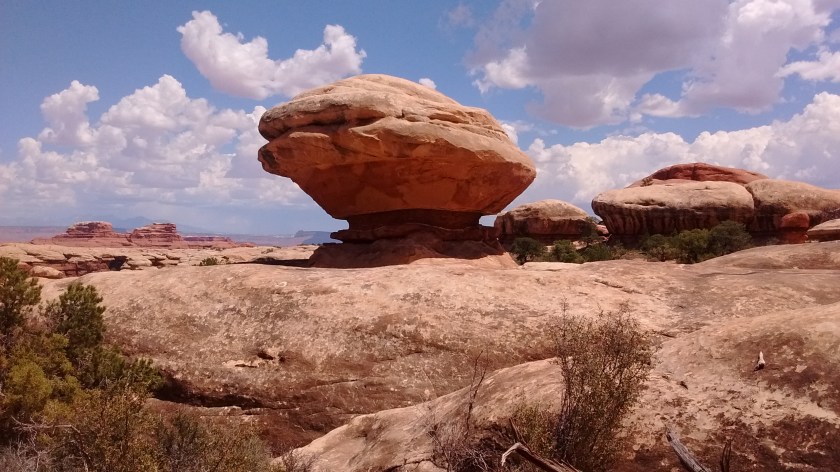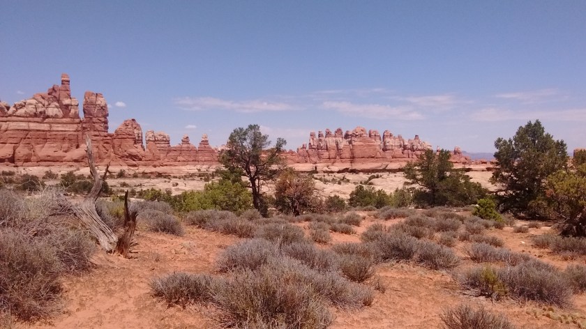 I had expected that since this is one of the popular National Parks there would be a lot of people, but it was relatively deserted. Maybe most people are smarter than we are and don’t hike in Canyonlands in August. It was 100 degrees when we got back to the car. I didn’t know my body could produce so much sweat. But we survived and it was worth it to enjoy the awesome red rock formations.