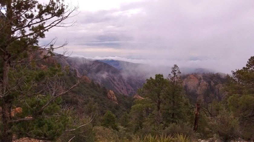 We debated whether to immediately drive out or to take our chances on the weather and hike as planned. It was early enough that we decided to hike and then if the weather didn’t improve we could turn around. Sometimes it looked like the clouds were moving out but they never got far before moving back over the sun. As we climbed higher up the trail the views were impressive, even if somewhat lost in the cloud cover.