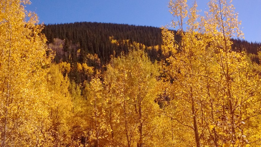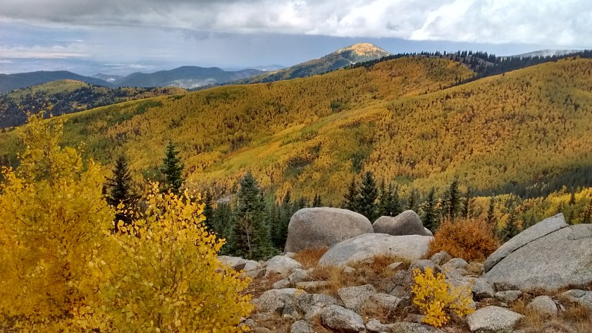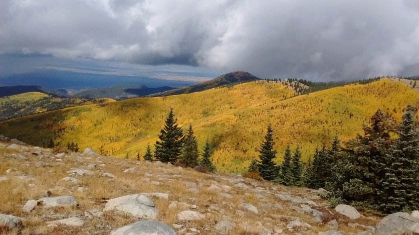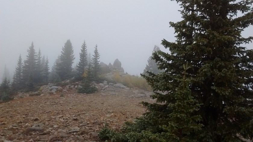 Since the aspens were brighter last year I couldn’t resist including some of the photos from then. The rest of the pictures here were actually taken one year ago. The first one is the fog at the top before the clouds lifted. Then some of the views from the top and from the way back down when we could see what was hidden on the way up.