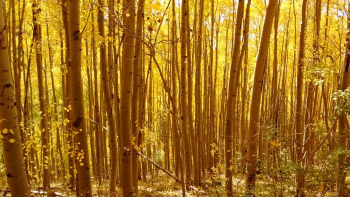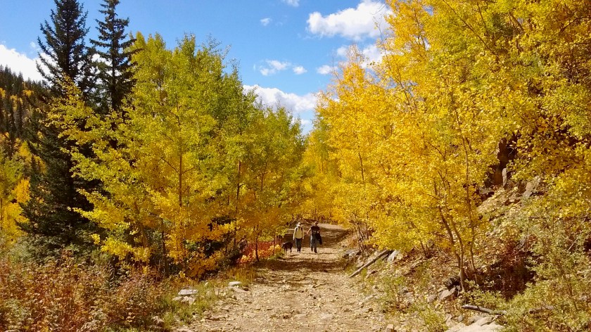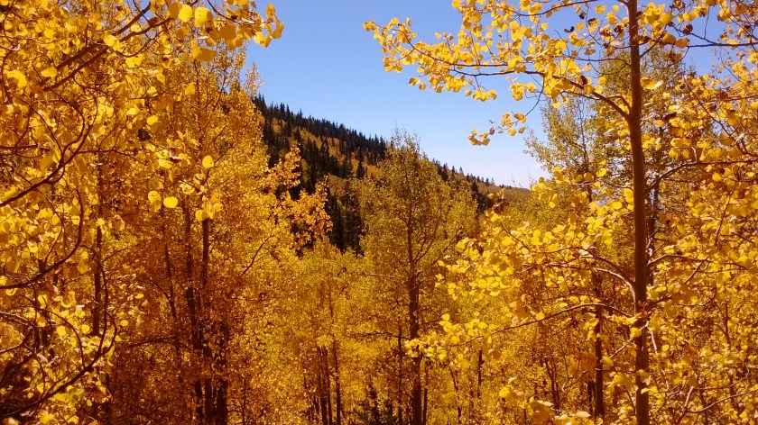Speaking of the return of sunny days, it was interesting to compare the hike today with the one a year ago. The mountain slopes last year were totally shrouded in mist and fog when we started the hike. On the way up the trail we could only see the aspen trees next to the trail; none were visible in the distance. At the viewpoint at the top we thought we weren’t going to see anything, but then suddenly the clouds rolled away and we were astounded at the golden vista in front of us.