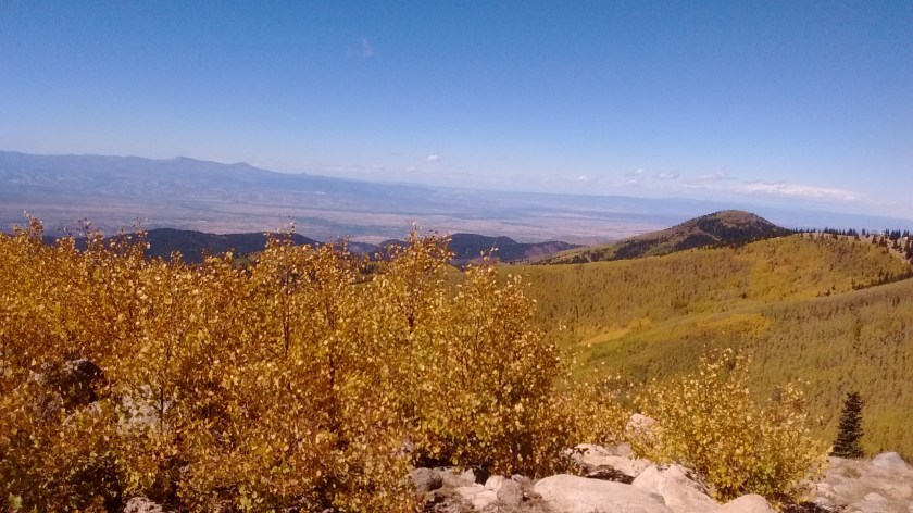 Today was clear and sunny from the start of the hike. The aspens this year weren’t quite at the peak of color on some of the slopes. Especially from the viewpoint at the top we noticed more green mixed in with the gold. But this time we could see a lot further out over the surrounding desert.