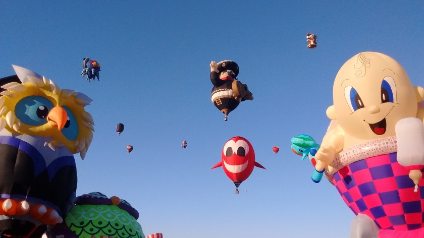 We were there Saturday for the mass ascension on opening day and then again today for Special Shapes Rodeo. Although the balloons were able to launch on Saturday, the effect of hundreds of balloons overhead wasn’t evident like it was today. Balloonists enjoy Albuquerque’s weather because of a “box” effect where the wind takes the balloon up in one direction and then at a certain level the wind will catch it and blow it back in the opposite direction. Saturday it was just a straight wind and the balloons quickly passed into the distance. Today many of them went up in one direction and then we saw them float back towards us again, even sometimes landing back on the field again an hour or two after they had launched.