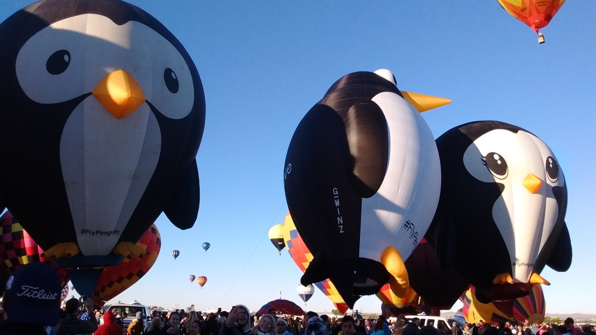 We were there Saturday for the mass ascension on opening day and then again today for Special Shapes Rodeo. Although the balloons were able to launch on Saturday, the effect of hundreds of balloons overhead wasn’t evident like it was today. Balloonists enjoy Albuquerque’s weather because of a “box” effect where the wind takes the balloon up in one direction and then at a certain level the wind will catch it and blow it back in the opposite direction. Saturday it was just a straight wind and the balloons quickly passed into the distance. Today many of them went up in one direction and then we saw them float back towards us again, even sometimes landing back on the field again an hour or two after they had launched.
