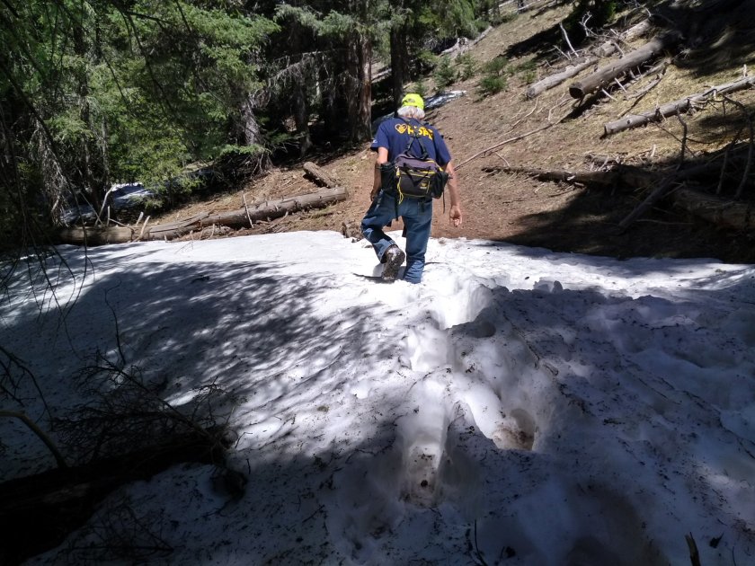 After  passing the lake the trail follows Clear Creek to an intersection with another trail near a meadow which we knew would be a good lunch spot and turnaround point. We couldn’t quite make it, though, to the intersection. The snowbanks along the creek were in heavily shaded areas and got deeper and deeper as we approached the meadow. We tried climbing higher up the rocky slopes next to the creek where the snow had melted but finally decided to just make do with eating our lunch in one of the open sunny spots before heading back down.