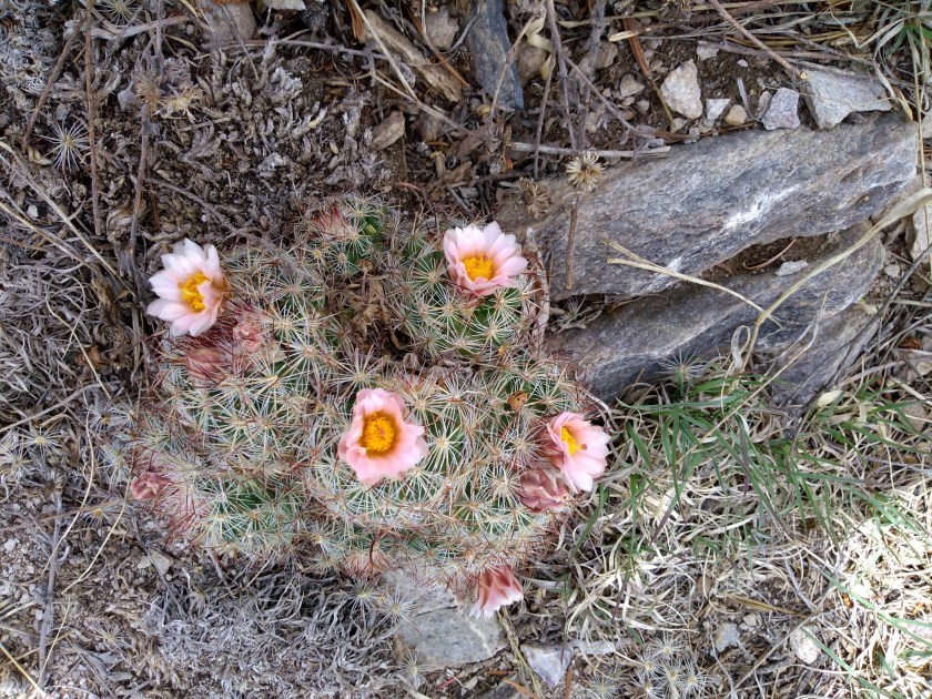 We have had such a dry spring that there weren’t very many wildflowers, but there’s always something to surprise us. For example, we didn’t have too much further to go getting back to the bottom of the canyon, when we spotted a single columbine blossom hiding in the undergrowth. We see lots of those hiking in the Sandias, but I don’t think we’ve ever seen one in the Manzanos. Another surprise at the peak itself was to find numerous cactii in blossom of a variety that has become a favorite of mine. I think they are Simpson’s Hedgehog, but haven’t researched them in detail.