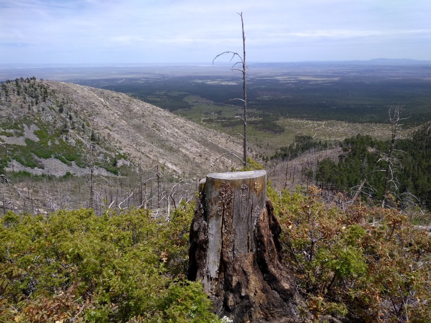It’s a good workout to get to the 10,000 foot peak, the highest point in the Manzano Mountains. The trail starts at 8,000 feet elevation and intersects the Crest Trail after 3 miles or so of uphill. From there it is about a mile of up and down along the Crest to get to the peak. It’s not the most scenic place to hike because much of the trail goes through a large area of forest that was burned during the disastrous Trigo Fire of April 2008.