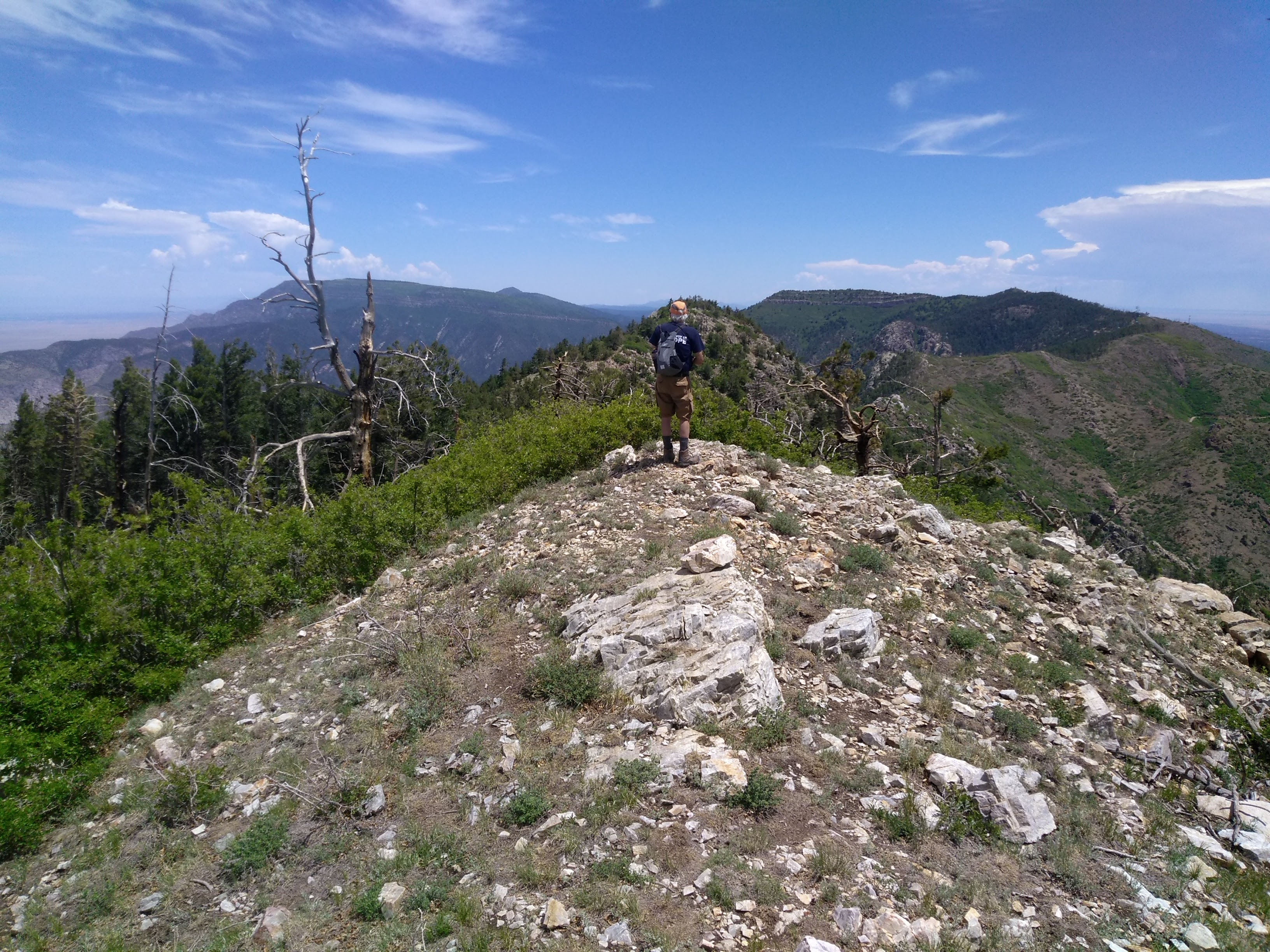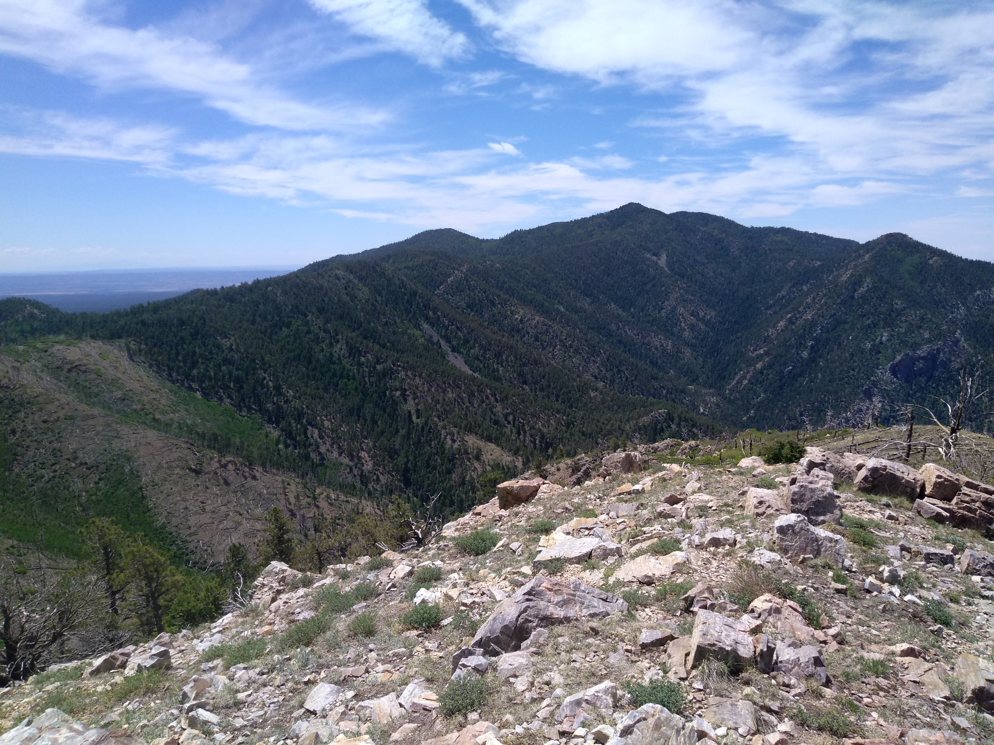 Last November we discovered a short 2-mile trail on the east side of the Manzano Mountains that started at a National Forest campground and steeply climbed up to the Crest Trail. The day we hiked it we were not prepared for how cold and windy it was on the crest. When we reached the trail intersection we could see that by going just a bit further to the north along the Crest Trail we could make it to Osha Peak. But since neither one of us was willing to brave the elements we beat a hasty retreat back down to a spot out of the wind where we could eat lunch. Today we went back and this time we bagged the peak.
