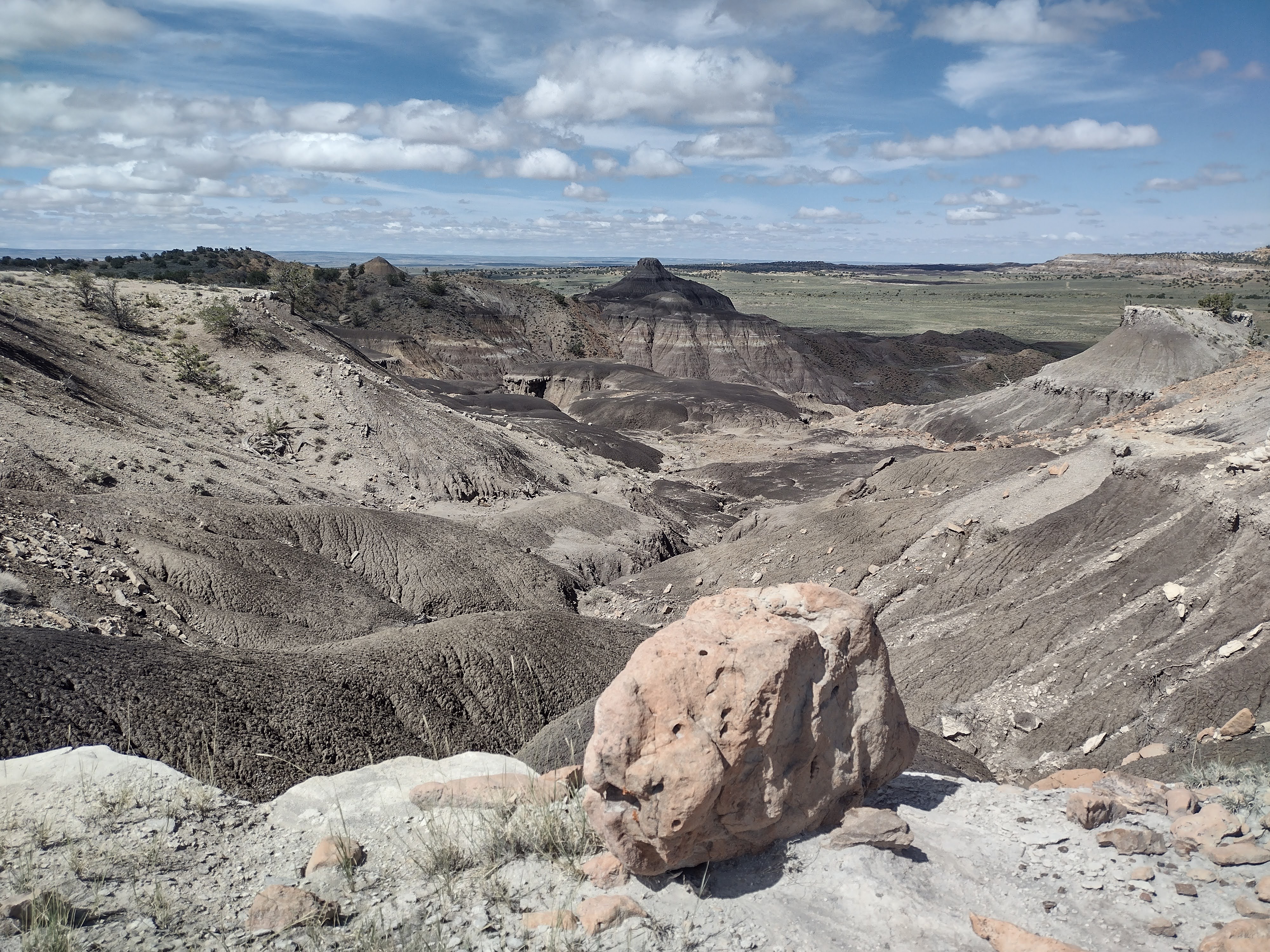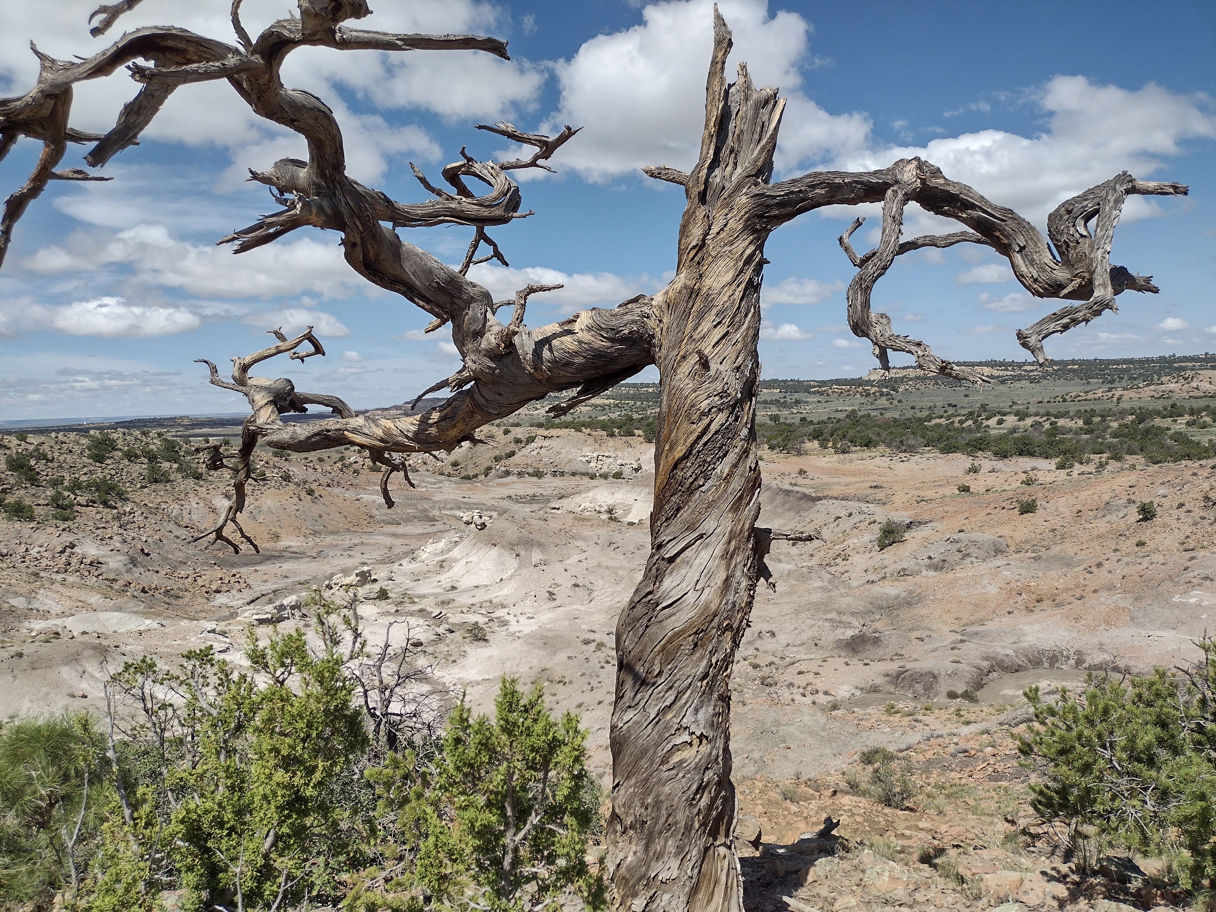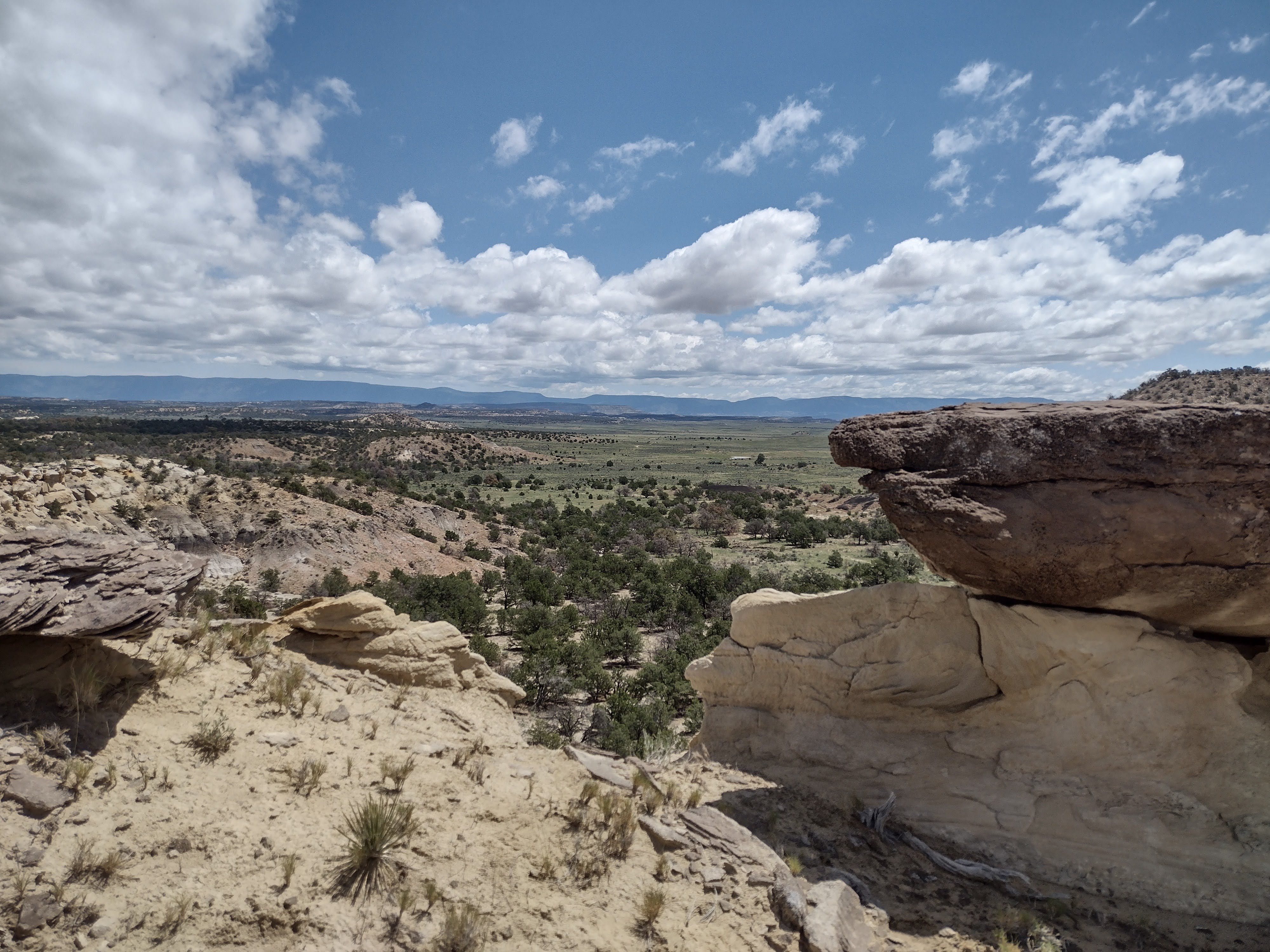 On a sunny August Saturday it’s a safe bet that hiking trails in the mountains around Albuquerque and Santa Fe will be popular destinations. But by driving a little over an hour to Cuba and then heading down one of the many dirt roads outside of town it’s possible to spend a pleasurable day hiking on BLM land without seeing another human being. Maybe one or two cows occasionally appear along the road, but, otherwise it’s just us and the vast sky stretching over miles of eroded rock formations interspersed amongst sagebrush, pinon, juniper and even some ponderosa pine.