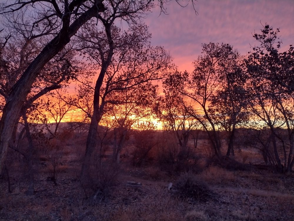 Winter days with their minimal number of daylight hours leave me craving warmth and sunshine more than ever. It’s especially difficult when it’s time for my morning jog and the thermometer reads well below freezing. But once I overcome my body’s resistance to get out and get moving there is generally some rewarding encounter that you won’t find any other time of the day. This morning that encounter was the opportunity to track the progress of sunrise in the mountains to the east as I made my way through the bosque.