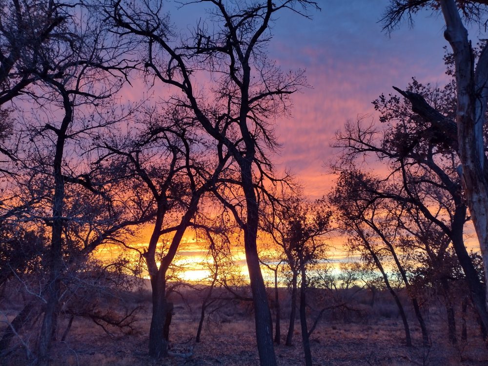 We are rewarded with colorful sunrises on the days when there is some cloud cover. A storm system was moving our way which meant I wouldn’t be able to enjoy the sun’s warmth as it made its way over the mountain. It was definitely anticlimactic once the sun got here. Of course, by that time my loop through the bosque was complete and the viewpoint wasn’t the same. There’s always the warmth of breakfast to look forward to!