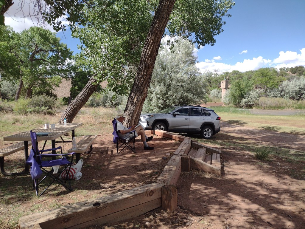 The wind had started to pick up in the afternoon when we were ready to look for a campsite. The larger campgrounds were by the lake but we knew it would be less windy down by the river. Two small campgrounds, one on each side of the river are nestled in amongst the cottonwoods, just below the outlet from the dam. We could hear the rush of water from the spillway throughout the night; not exactly a natural waterfall but soothing, nevertheless. And, best of all, we were the only campers on either side of the river, making for a peaceful and quiet night.