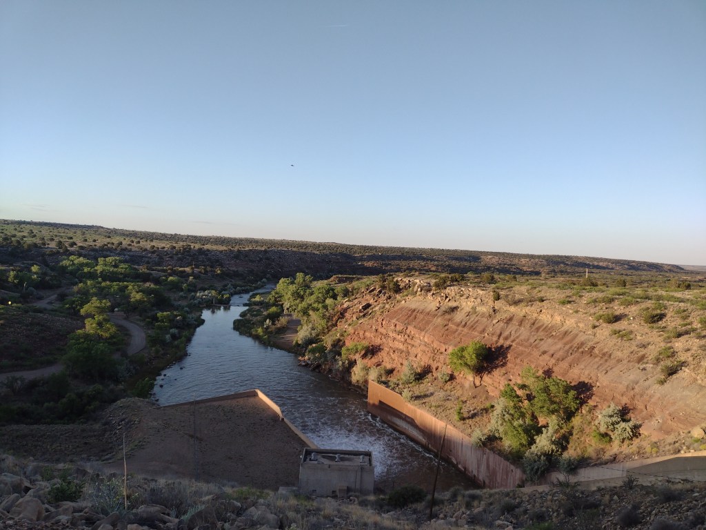 In the morning it was a short walk up the road to get to the top of the dam, where we could look down at our campsite. We had chosen the west side of the river so that we would be first to get the morning sun.