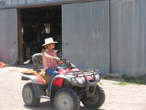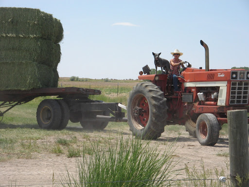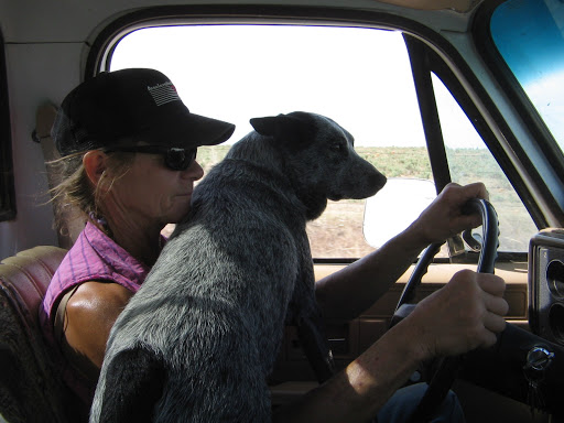 Boone, faithful dog, rides everywhere with her and helps with herding the cattle.