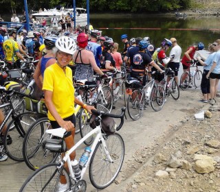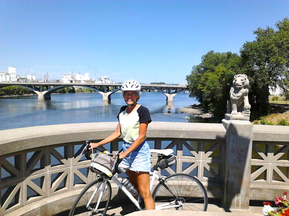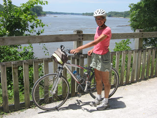 The traditional way to mark the end of the ride across Iowa is to dip your bike tire into the Mississippi River at the ending town. Today I joined the crowd of bicyclists pushing their bikes towards the dip site in Clinton, Iowa, just so Lee could take a picture showing I was actually there. All the hard work of the week pedaling from Sioux Center on the Missouri River to Clinton on the Mississippi River was finally done so it didn’t seem that important whether I actually got the bike tire in the water or not.