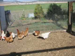 Eleven chickens, let out of their pen each afternoon, for “free range” time.