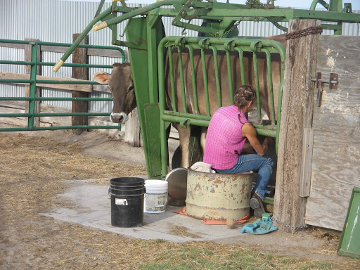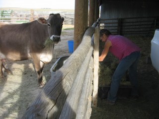 Candy, the dairy cow, needs to be milked twice daily and then given feed and water.