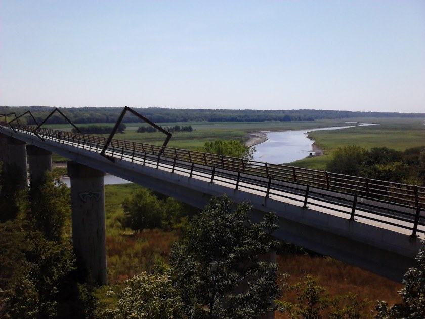 The bridge is quite impressive and it’s a thrill to be so high up over the Des Moines River and surrounding valley. The remainder of the 10 miles that we rode into Slater were not that exciting. There was a nice city park where we ate lunch in Slater before turning around. But a rails-to-trails is flat and open to the sun beating down and not an ideal ride on a hot Iowa summer day.