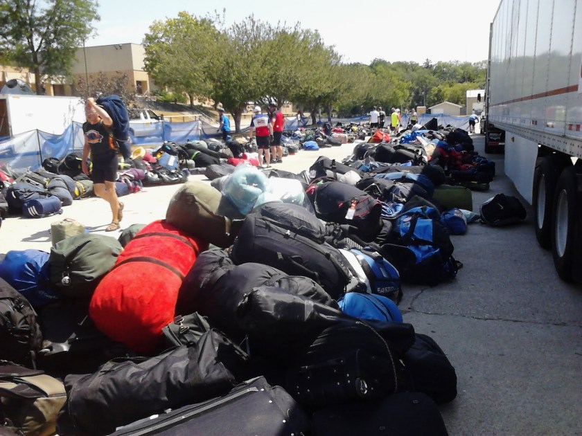 I didn’t hear any statistics on amount of rainfall last night in Marshalltown, but it definitely wasn’t enough to break the drought. It did thunder and lightning and a severe storm warning was issued. We were already in our tent, but talked to some riders today who said people who had gone downtown on the shuttle were told the shuttles wouldn’t take them back to camp until the storm threat passed. A group in our campground this afternoon was making repairs to their tent and drying out their clothes in the sun. They said when the shuttle finally got them back to camp they discovered the wind had blown over their tent.