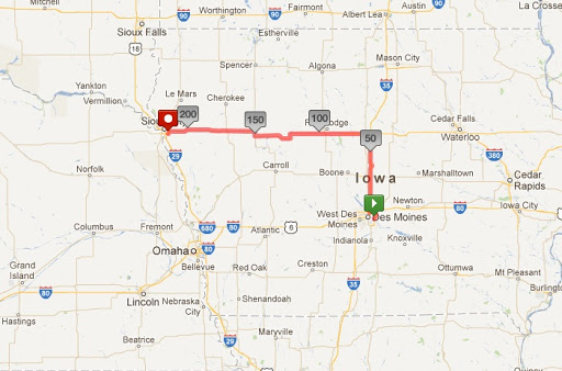 Today we left Des Moines and drove 200 miles closer to Sioux Center, Iowa, where RAGBRAI starts the day after tomorrow. We are resting up in a motel near Sioux City, Iowa. Names of locations here are confusing. The map above shows Sioux City and to the north is Sioux Falls, South Dakota. But the start of RAGBRAI is Sioux Center, which is too small to show up on this map scale. Sioux Center is about 50 miles north of here above Le Mars. That means we are in a good position for getting into the RAGBRAI starting town early in the day tomorrow. The day before the ride is such a madhouse that the sooner we can roll into town the more traffic we can avoid.