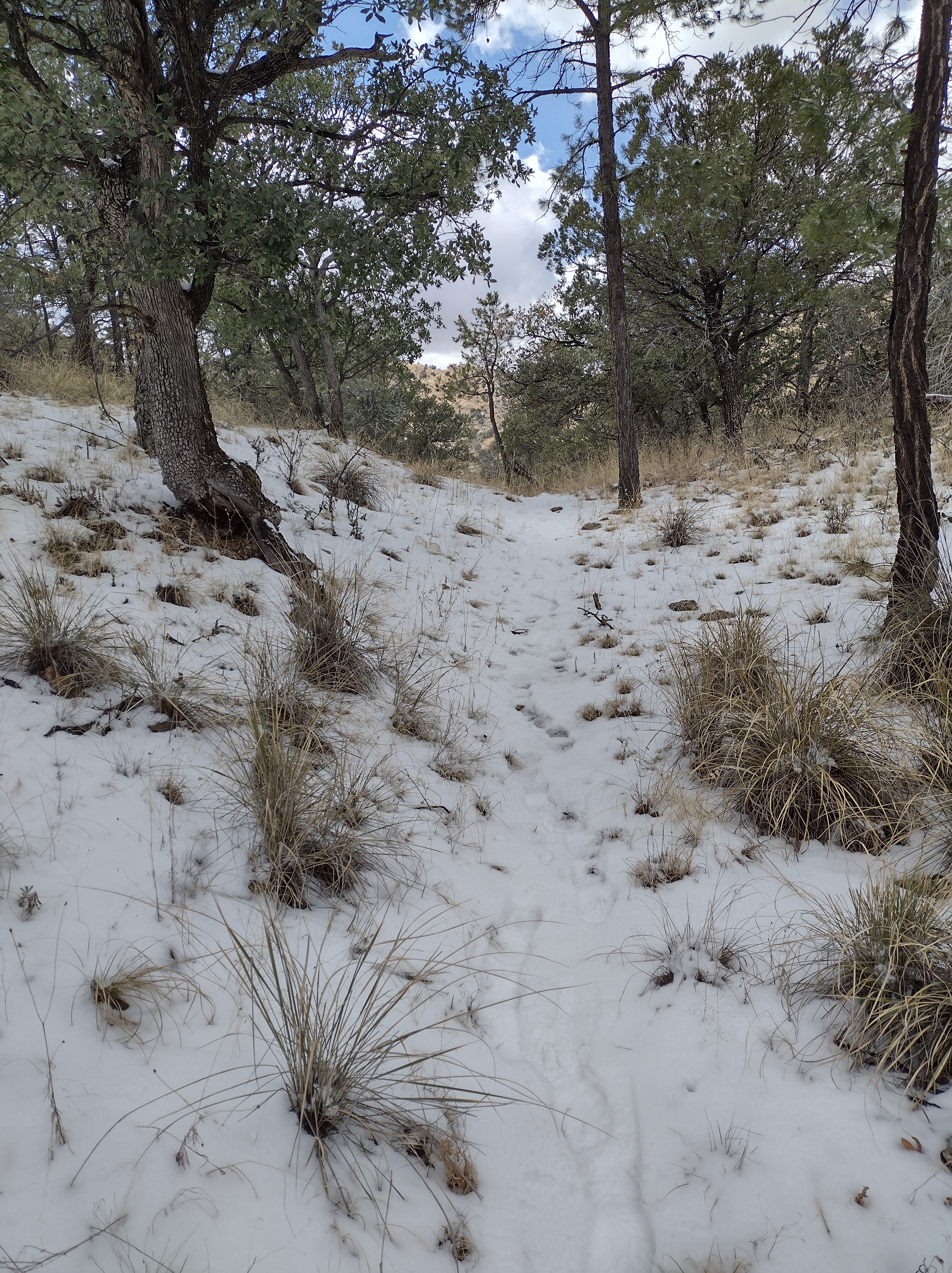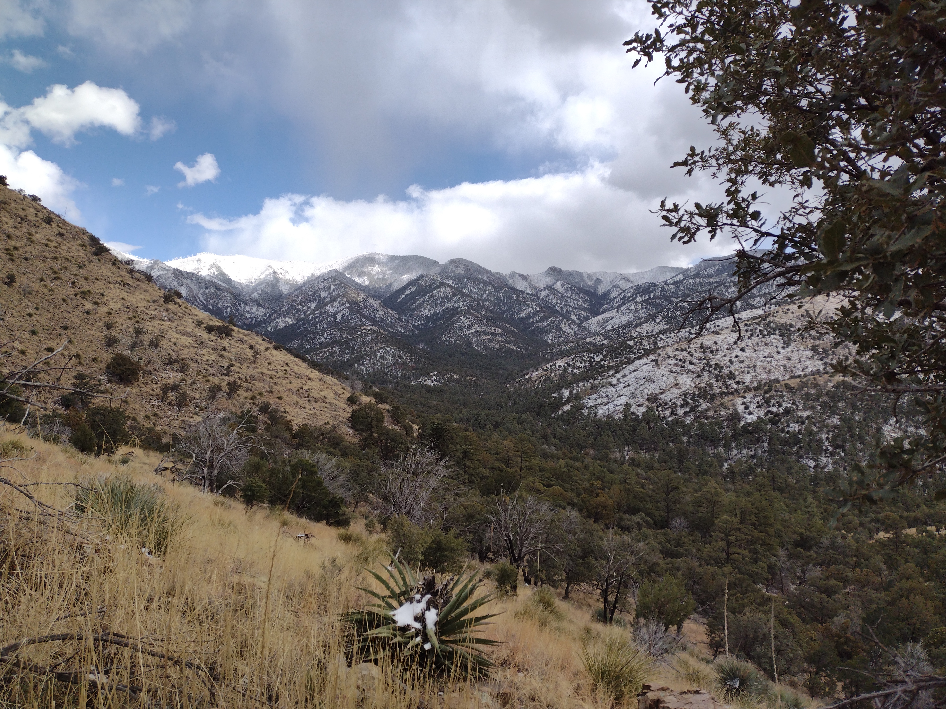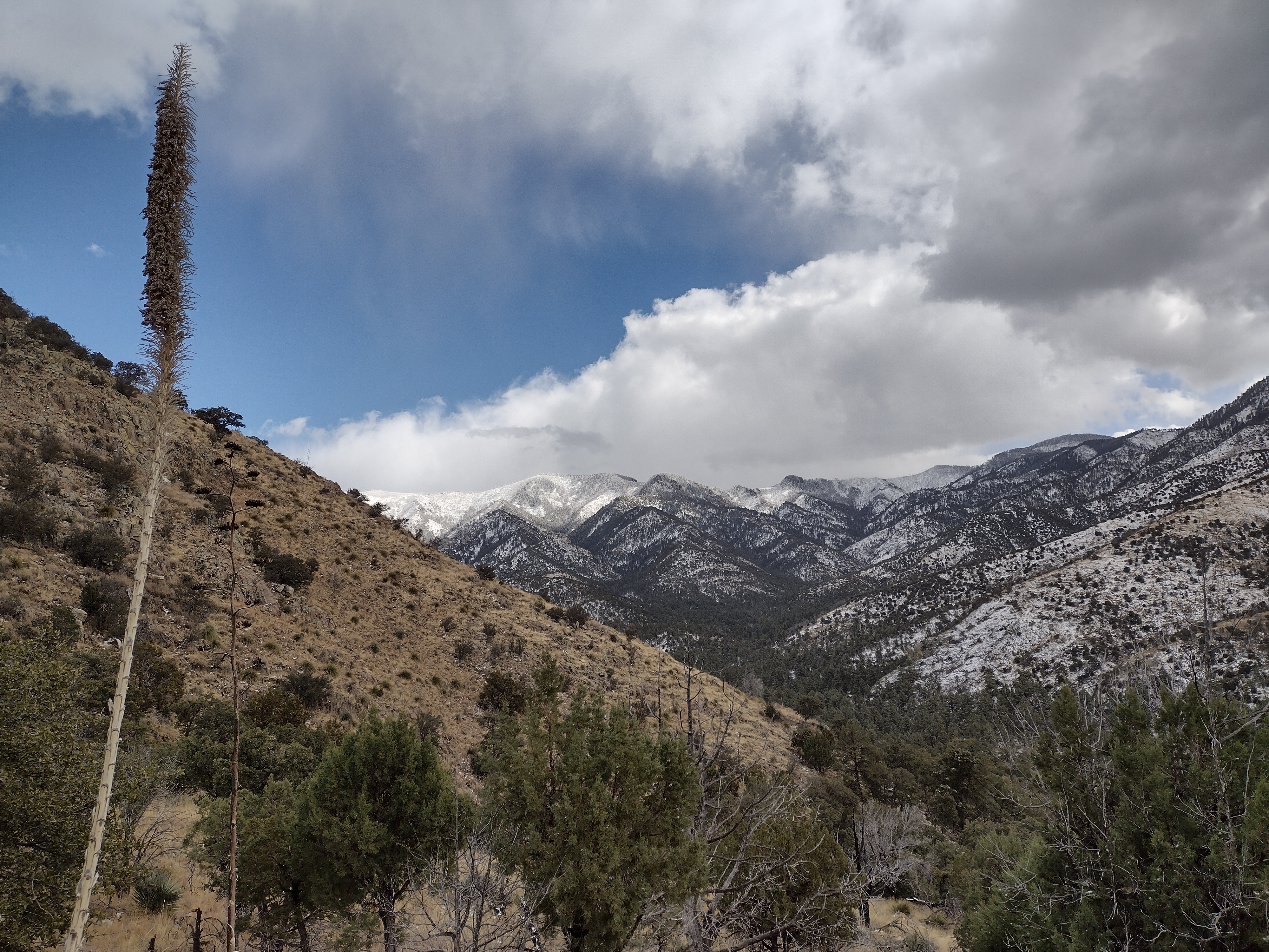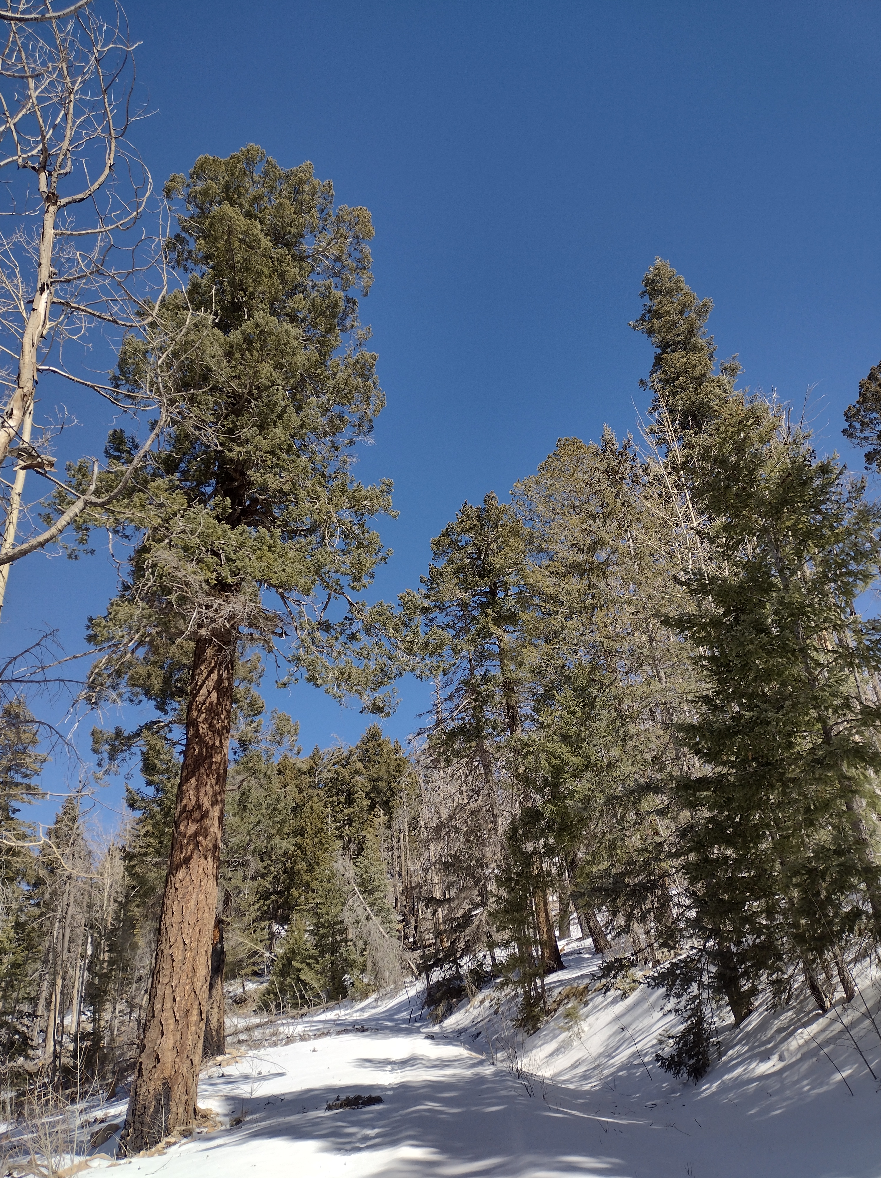 For today’s hike we once again made an adjustment to our plans after an up close look at the conditions. There were no clouds today, even on the mountain peaks. We were aiming for a hike on Mt. Graham, which has a paved, scenic road that leads up to the top with various National Forest campgrounds and trailheads along the way. Snow was visible on the top of the mountain but we thought maybe we could get on the south facing side and find some clear trails.