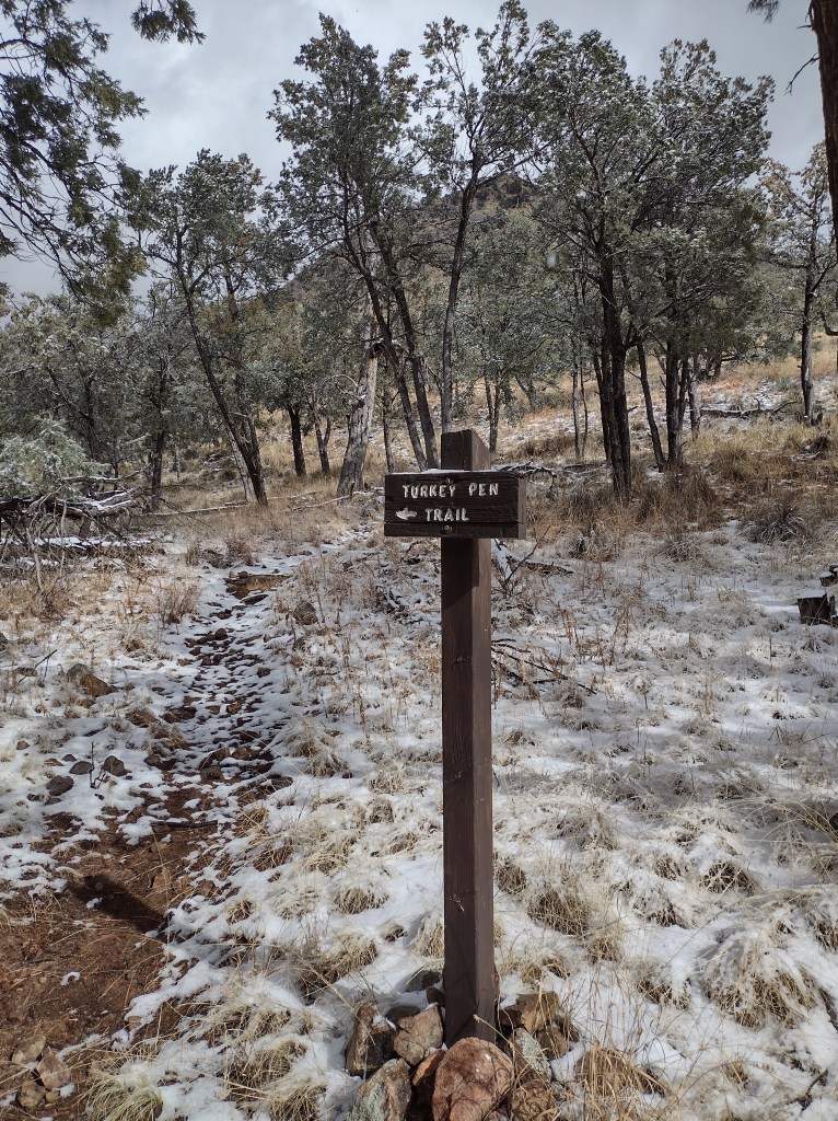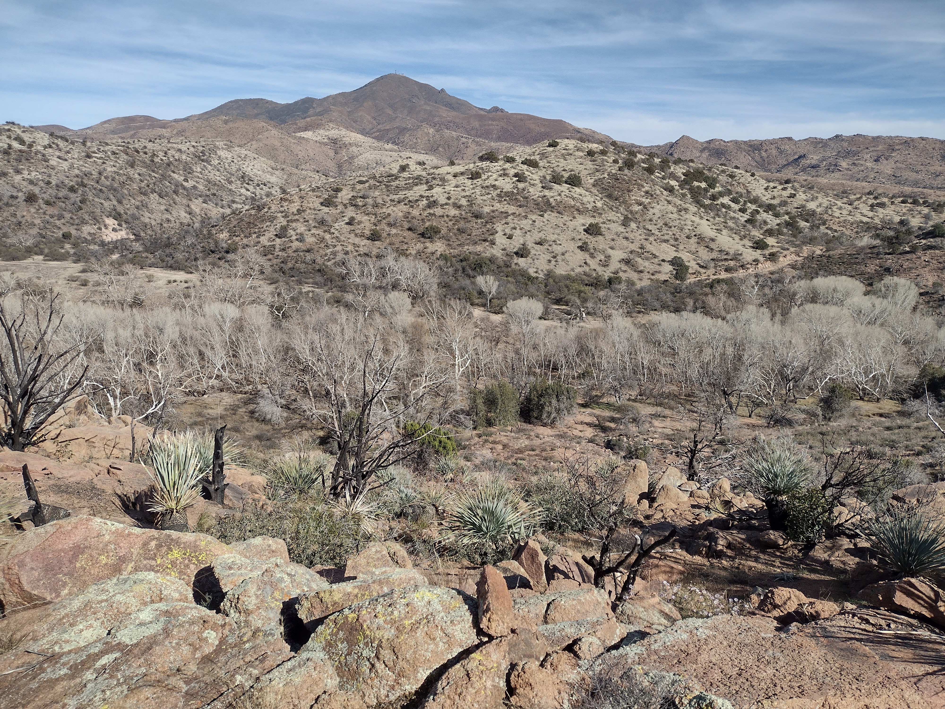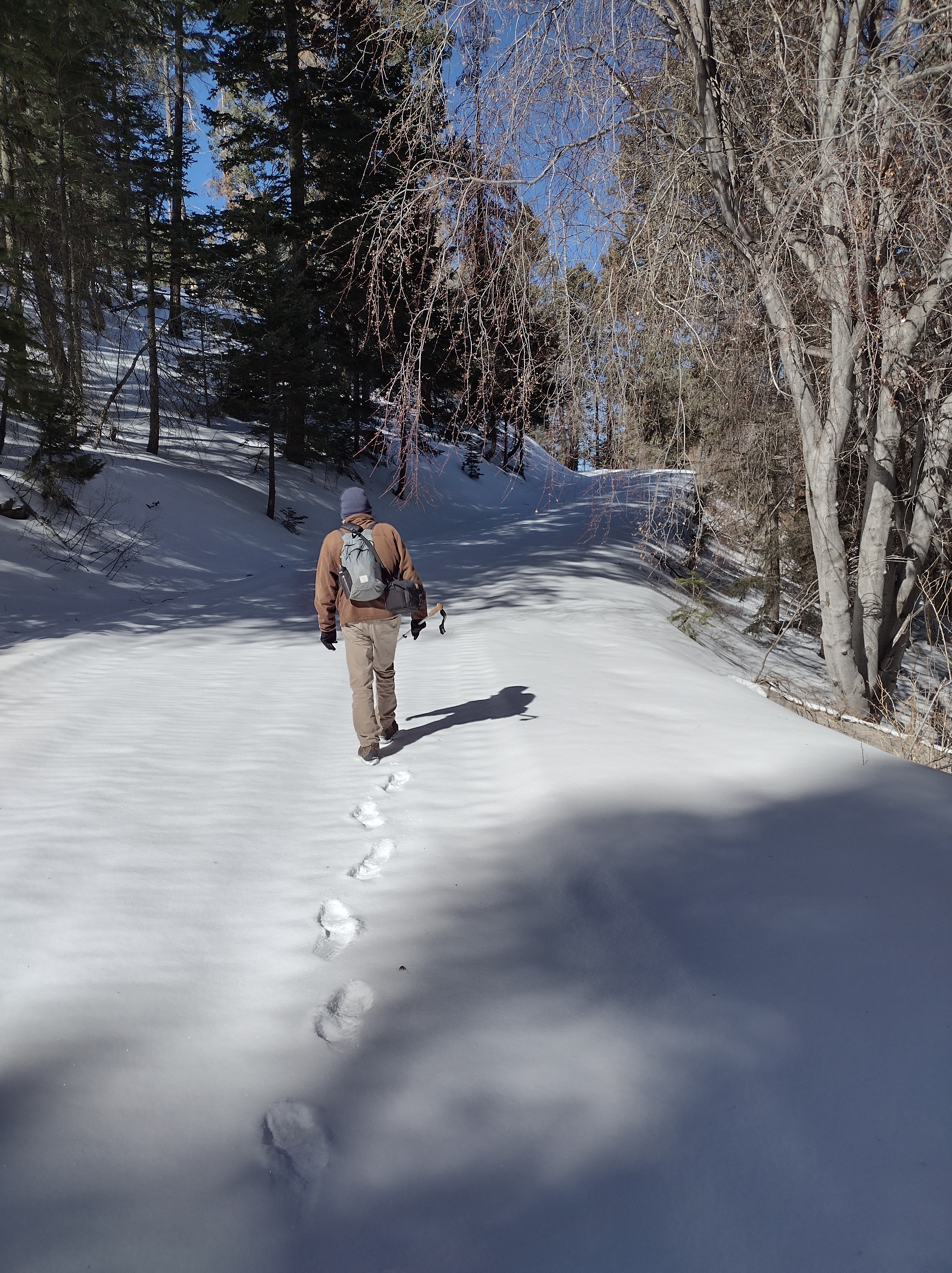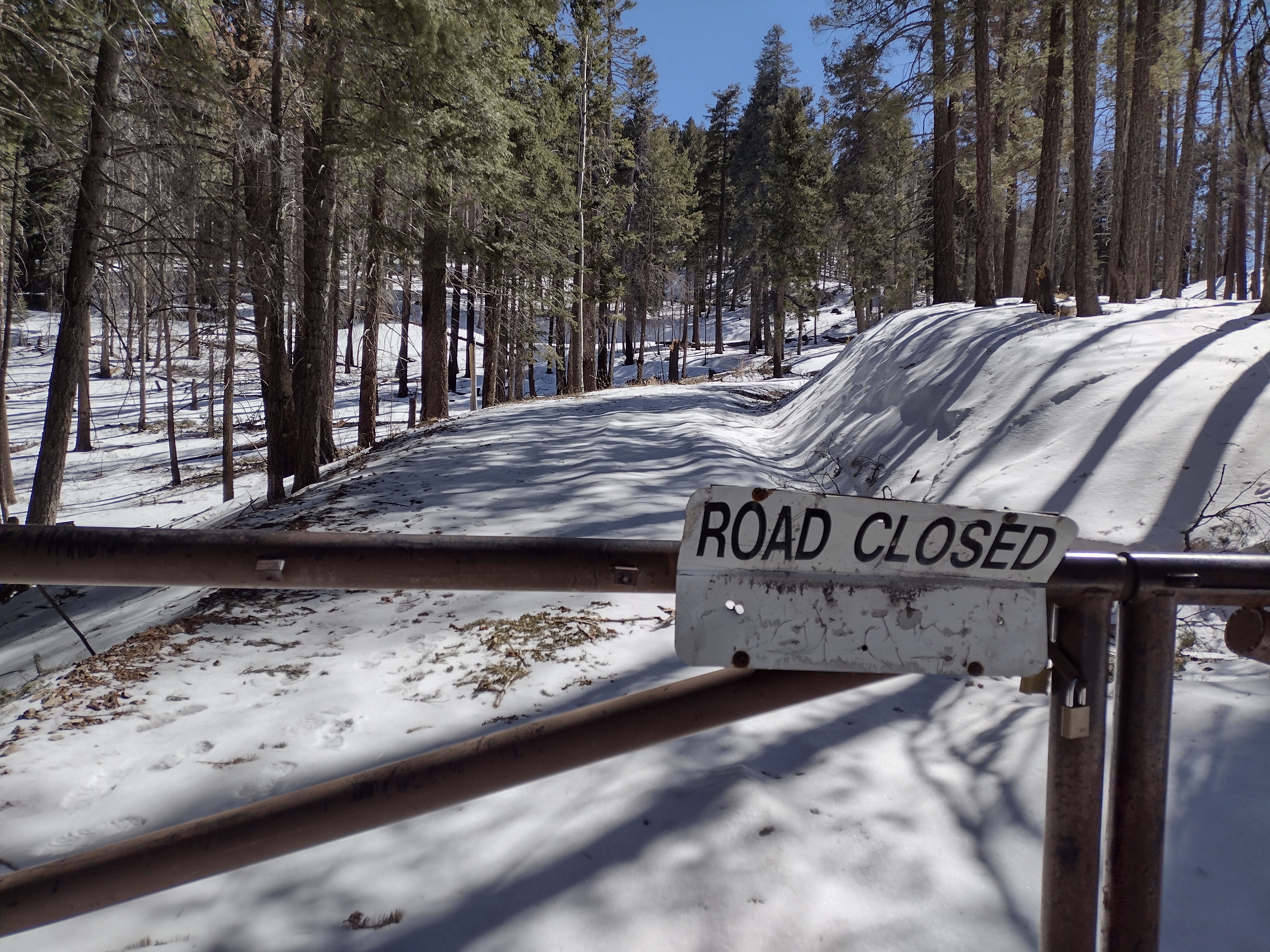 For today’s hike we once again made an adjustment to our plans after an up close look at the conditions. There were no clouds today, even on the mountain peaks. We were aiming for a hike on Mt. Graham, which has a paved, scenic road that leads up to the top with various National Forest campgrounds and trailheads along the way. Snow was visible on the top of the mountain but we thought maybe we could get on the south facing side and find some clear trails.