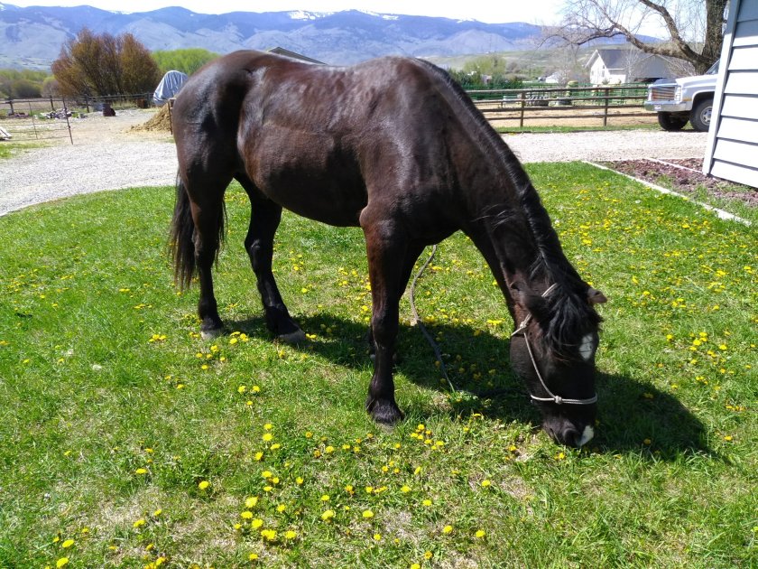 The calf wasn’t the new arrival that we had expected to see because we hadn’t heard much about the cows. We had been hearing more about her horses. Last year she had two horses, which she still has. But now there is a third horse, the very special mustang that she drove 750 miles, one-way, to purchase at a sale in Carson City, Nevada. When we drove in Thursday afternoon she had just gotten back from taking him out for a ride. Before she put him back in his pen she was letting him graze in the yard. He was sure enjoying the green grass and yummy dandelions!
