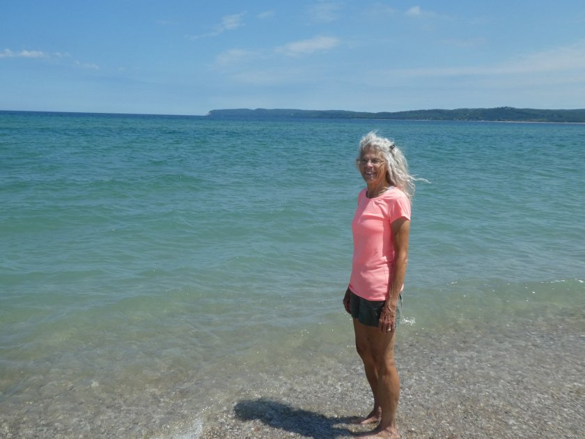 We didn’t drive to the Sleeping Bear Dune but on the road in that direction there was a stop where we got out and climbed up another dune. We then continued around the peninsula to a place that went down to Lake Michigan. Then we were able to say that we did dip our feet in one of the Great Lakes.
