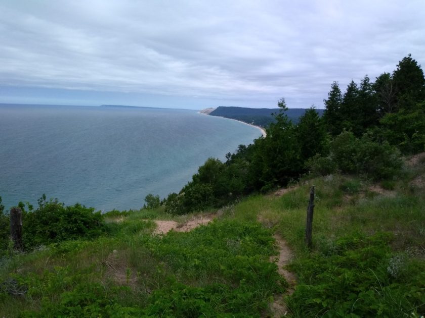 Our one tourist activity in Michigan was the day we drove to the Traverse City area and visited the Sleeping Bear Dunes National Lakeshore. After a stop at the visitor center (where we learned the sad story behind the name of the dunes) we headed out to hike the Empire Bluff Trail. It was a pleasant walk through the woods and led to an overlook where you could view the dune in the distance.