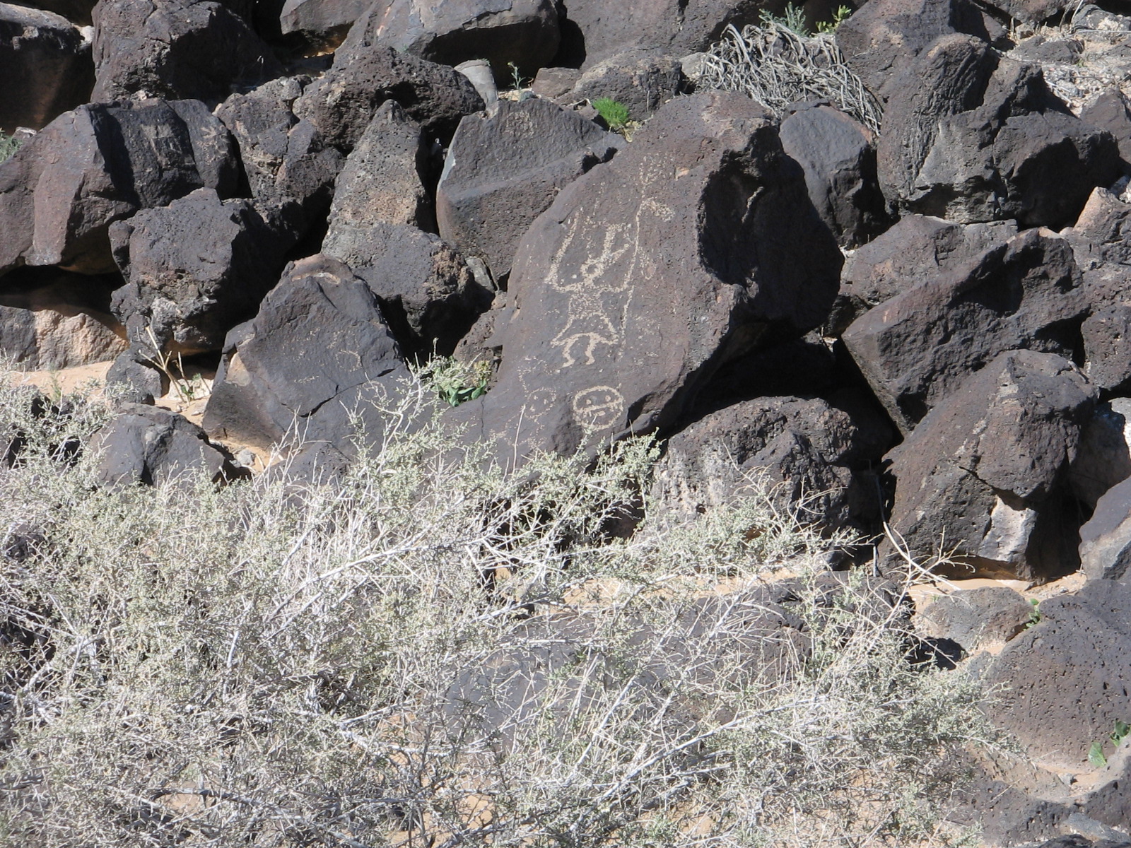 These formations are what’s left of the “fissure” volcanoes where the magma that rises up comes from cracks or fissures in the earth rather than through a central vertical vent. The volcanic activity here created the boulder-strewn escarpments that were used by American Indians and Spanish settlers as backgrounds for more than 20,000 petroglyphs.