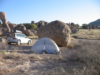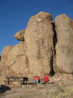 A combination of tent tiedowns, upended picnic table and a lot of prayer saw us through the night intact with no broken tent poles. I can’t say that I got a whole lot of sleep that night, but when you don’t have to get up for work the next morning, a bit of lost sleep isn’t that big of a deal. And at some point before daylight, the wind did begin to die down. By the time the sun was up we were able to boil water for our morning tea and set up our camp chairs next to the car, blocking what was left of the wind’s force and enjoying some time in the sun.
